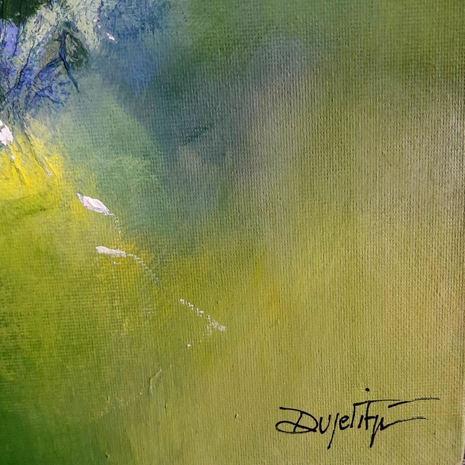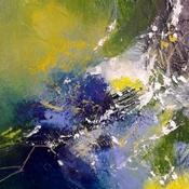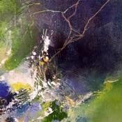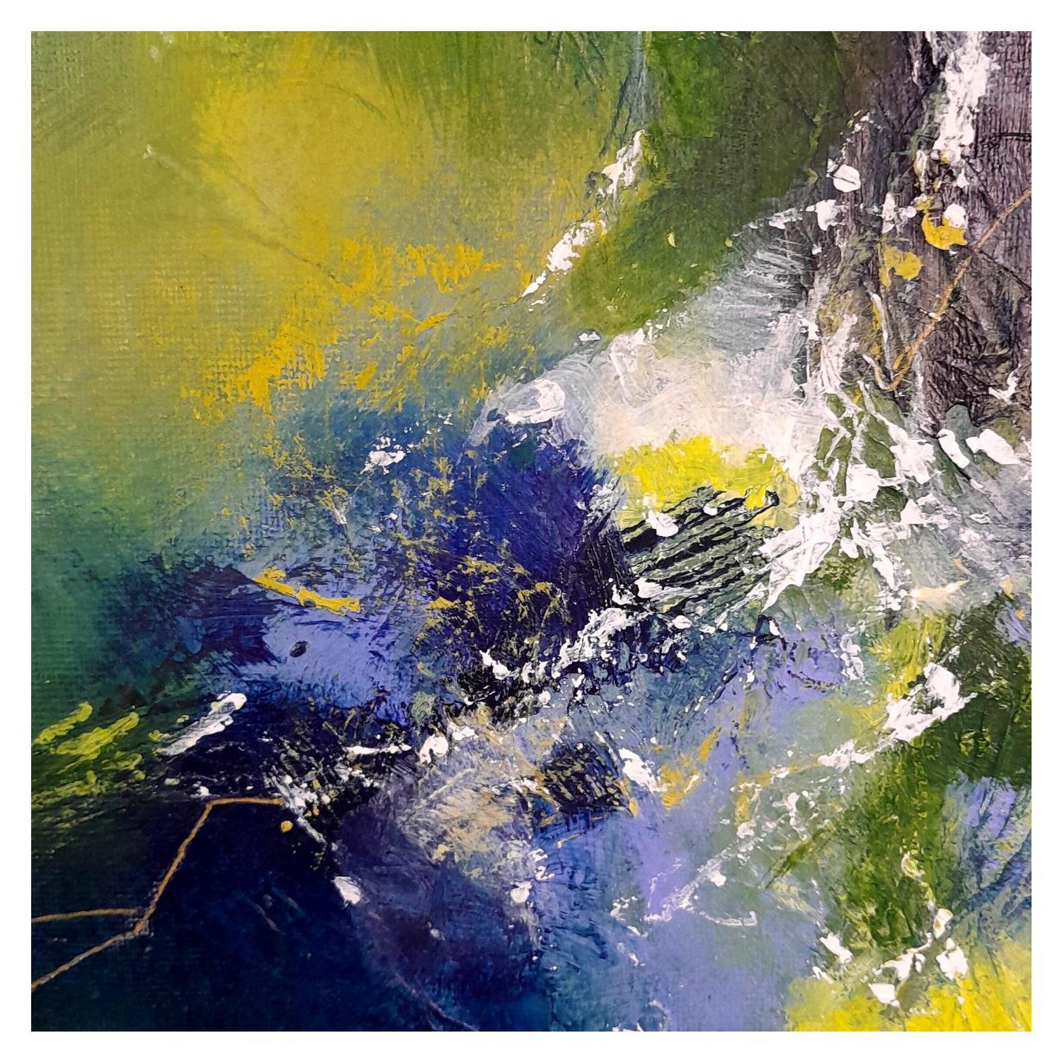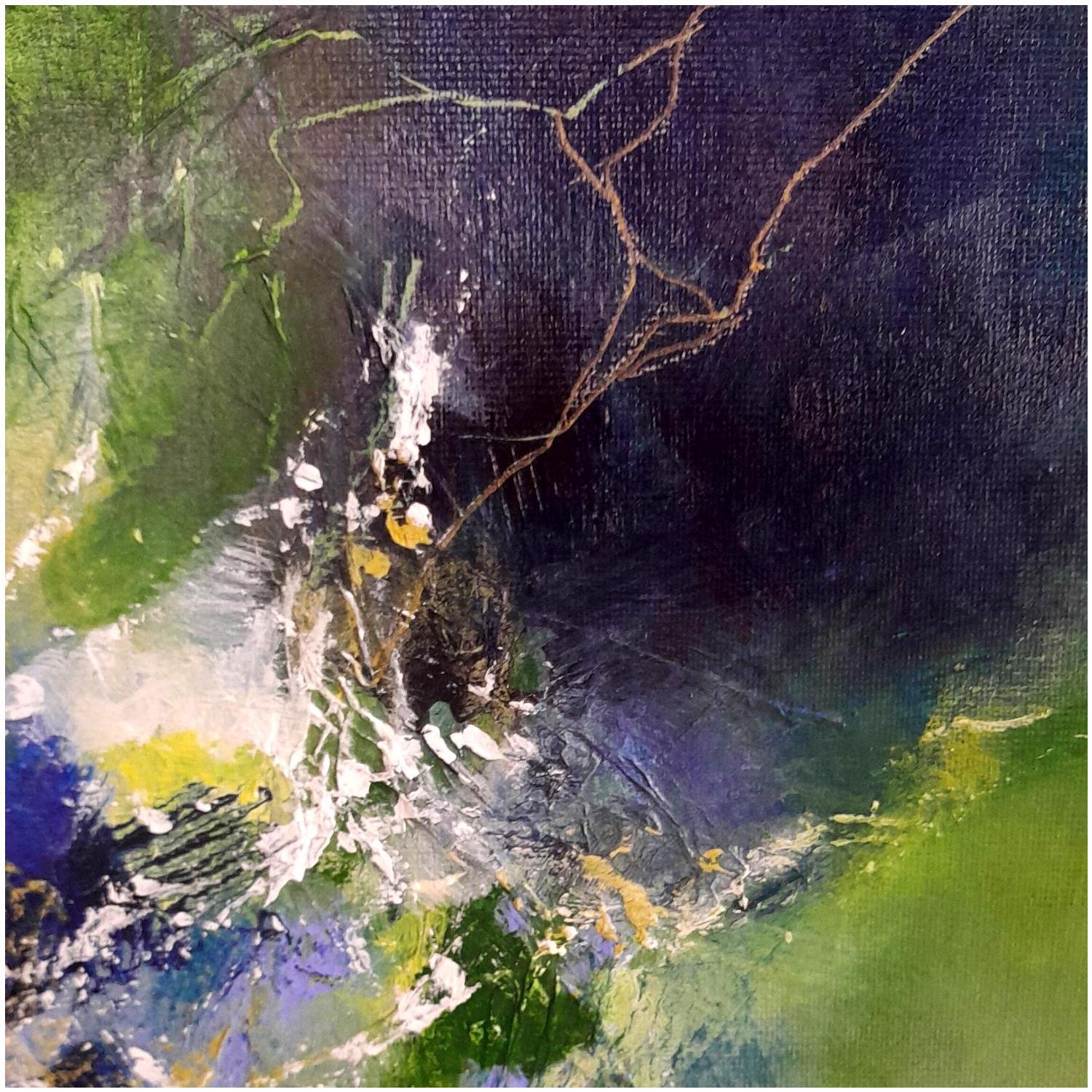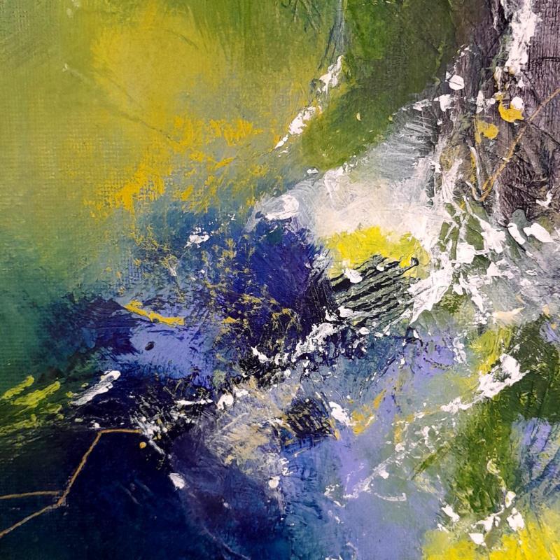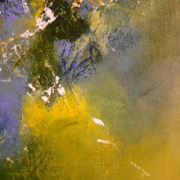 "Machen wir einen Spaziergang" ... im Wald. Ich wurde von der Natur und den Farben des Frühlings inspiriert. Die Spuren, die das Werk schräg durchziehen, sind eine Illustration der japanischen Kunst des Kintsugi, einer Kunst, die es ermöglicht, zerbrochene Gegenstände zu reparieren, indem sie die Risse sichtbar macht. Es ist also auch eine Erinnerung an eine Natur, die missbraucht wird, aber trotz allem schön und inspirierend bleibt.