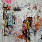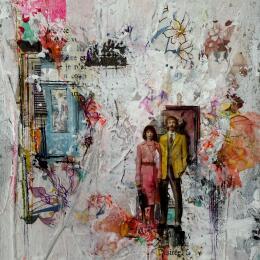Die Künstlerin verwendete Mischtechniken wie Collagen, Texturen, Stoffe, Pastellfarben und Acrylfarben, um dieses kleinformatige Gemälde auf weicher Leinwand in einem abstrakten, surrealistischen Stil zu schaffen.