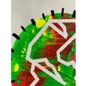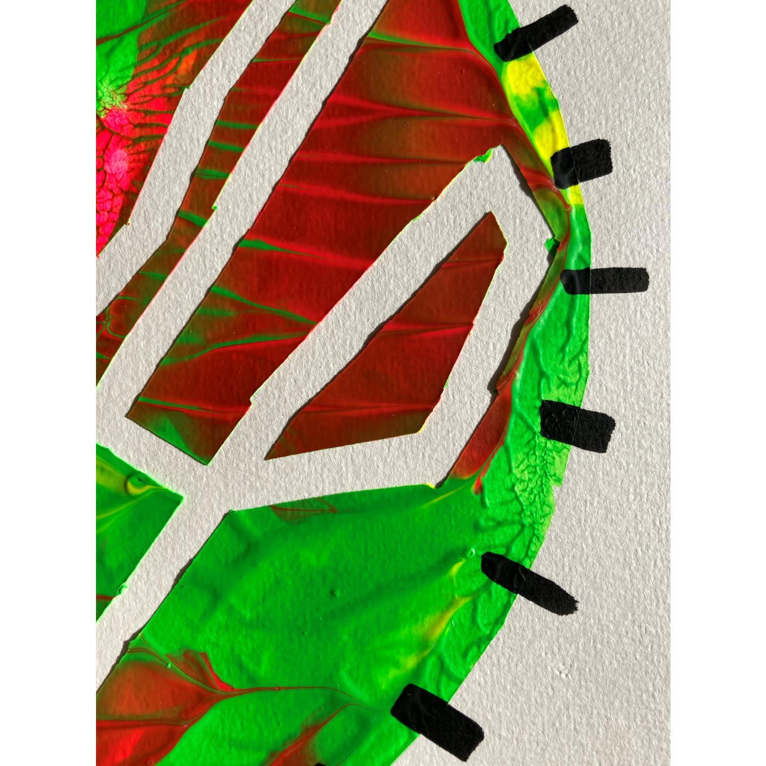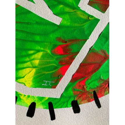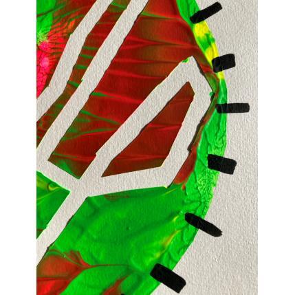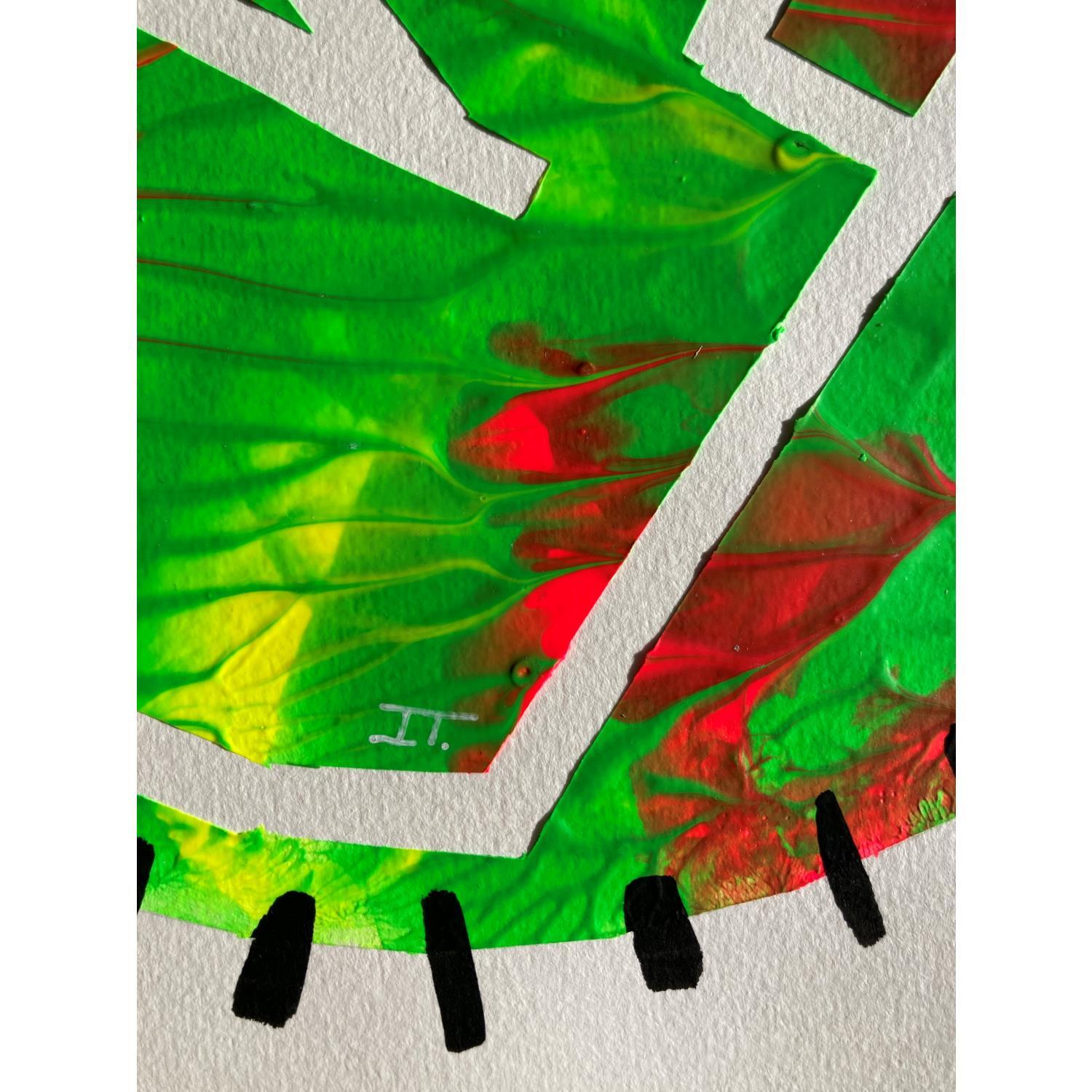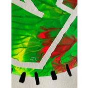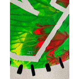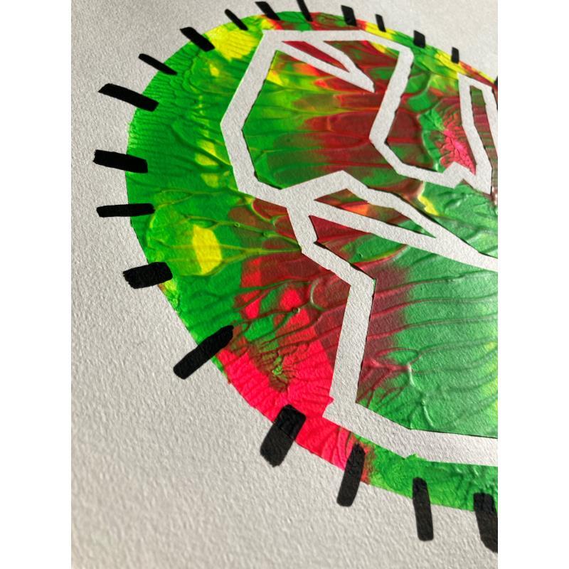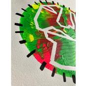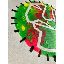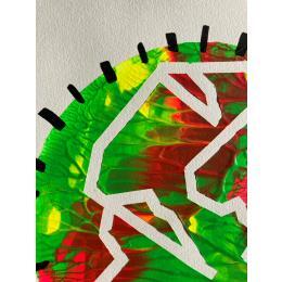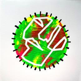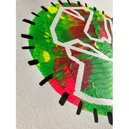 Dies ist eine einzigartige Arbeit, die jedoch "Twins 2" sehr ähnlich ist, da sie mit einer Technik gemacht wurden, die sich zusammengefunden haben, um diese Textur aus Malwellen zu schaffen, die wie ein Bergrelief mit grünen, fuchsiafarbenen und gelben Farben aussieht. Es hat ein negatives Gesicht, das aus einer einzigen durchgehenden Linie besteht, die nach links schaut. Es wird von kleinen schwarzen Linien eingerahmt, die sich über das gesamte Profil des Kreises erstrecken.