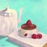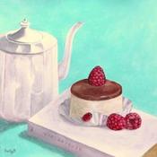 Dieses einzigartige und originelle zeitgenössische Kunstwerk "Teekanne, Buch, Himbeerkuchen und Marienkäfer" wurde von der zeitgenössischen Künstlerin Sally B. geschaffen.