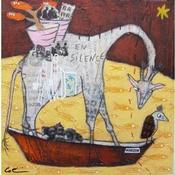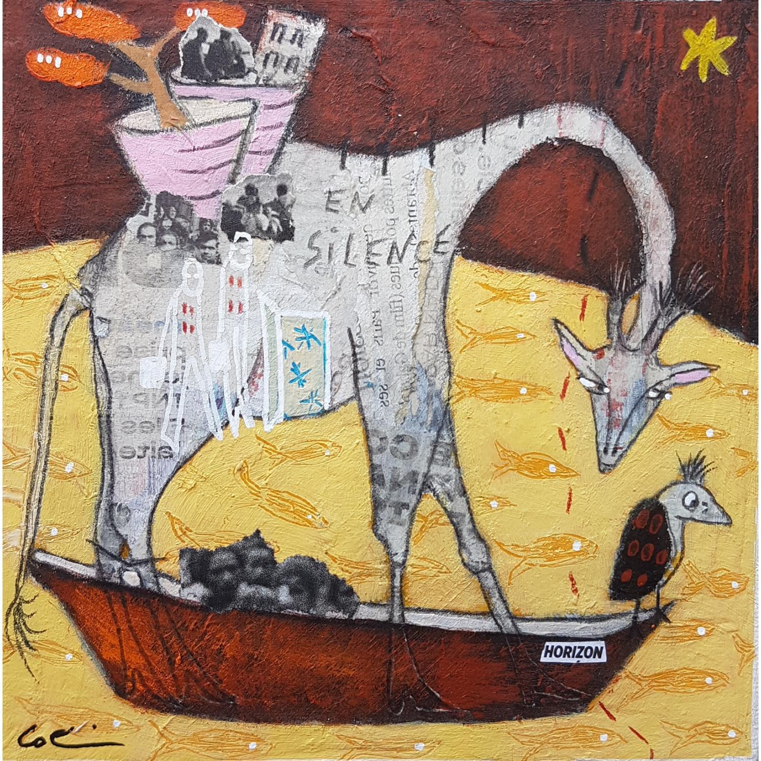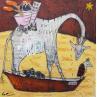 Der Künstler verwendete Acryl, Collage, Pastell auf Leinenkarton, um dieses Kleine Gemälde zum Thema "Tiere" anzufertigen.