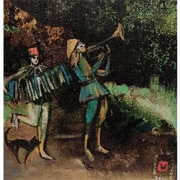 Der Künstler verwendete Acryl, Öl auf Leinwand, um dieses Kleine Gemälde zum Thema "Alltagsszenen" anzufertigen.