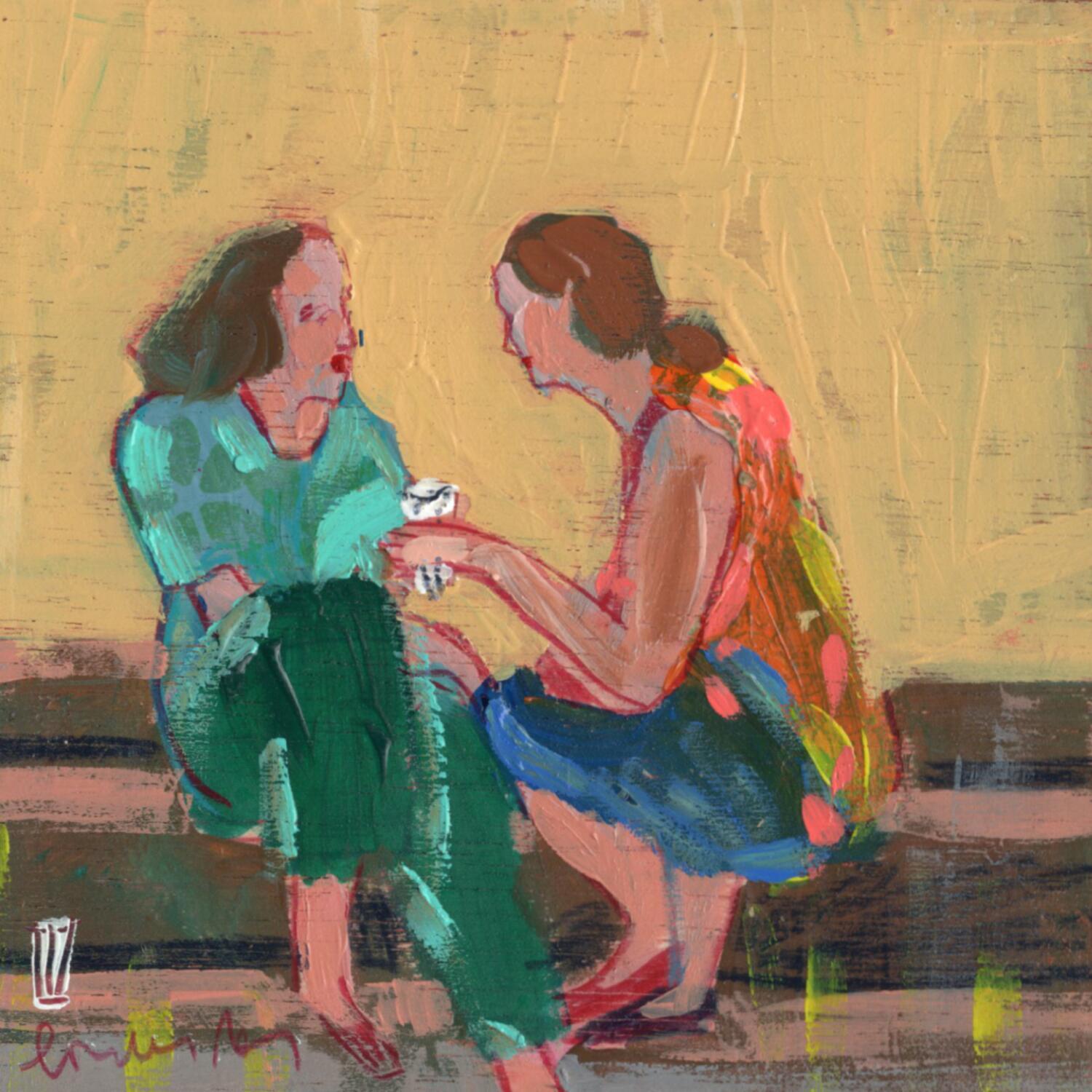Zwei Freundinnen sitzen auf einer Parkbank. Sie erklärt ihr, dass sie jemanden kennengelernt hat und glaubt, sich verliebt zu haben. Sie unterhalten sich über diesen potenziellen Partner, ihre Hobbys und ihre Freunde. In der Zwischenzeit trinken sie einen Tee zum Mitnehmen.