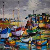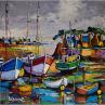 Dieses einzigartige und originelle zeitgenössische Kunstwerk im figurativen Stil wurde von dem Maler Cèdanne geschaffen. Der Künstler verwendete verschiedene Techniken, um dieses Gemälde auf Leinwand zu schaffen, und bearbeitete diese Ansicht der Bretagne, die Trawler bei Ebbe zeigt, in seinem eigenen einzigartigen Stil.