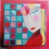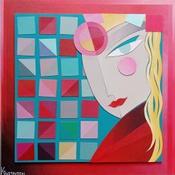 Der Künstler verwendete Acryl, Collage auf Holz, um dieses Kleine Gemälde zum Thema "Modus, Porträt" anzufertigen.