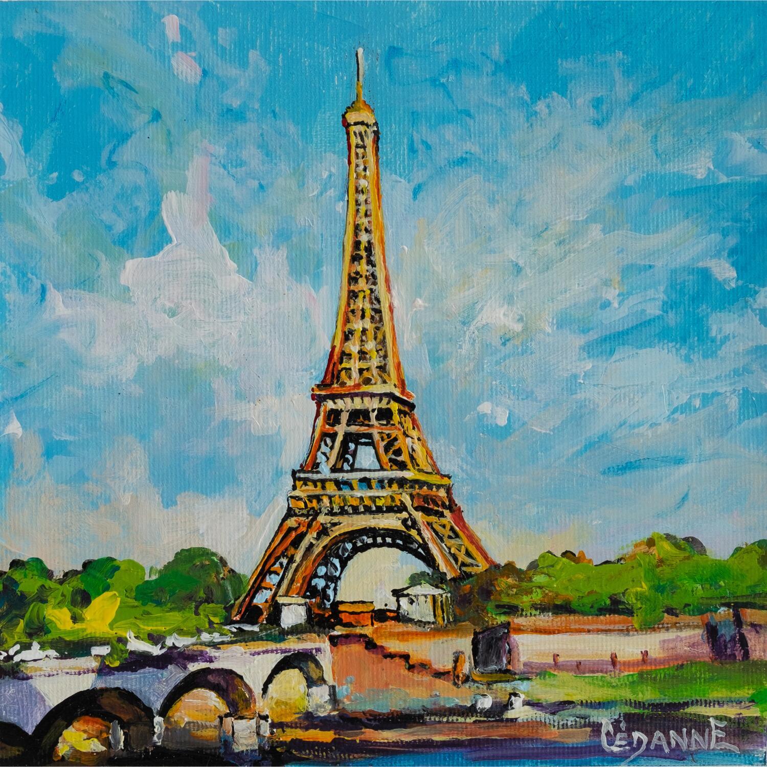 Dieses einzigartige und originelle zeitgenössische Kunstwerk im figurativen Stil wurde von dem Maler Cèdanne geschaffen. Der Künstler verwendete verschiedene Techniken, um dieses kleinformatige Gemälde auf Leinwand zu schaffen, und behandelte diese Ansicht des unvermeidlichen Eiffelturms mit dem ihm eigenen einzigartigen Stil.
