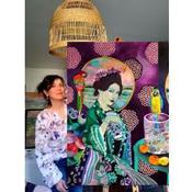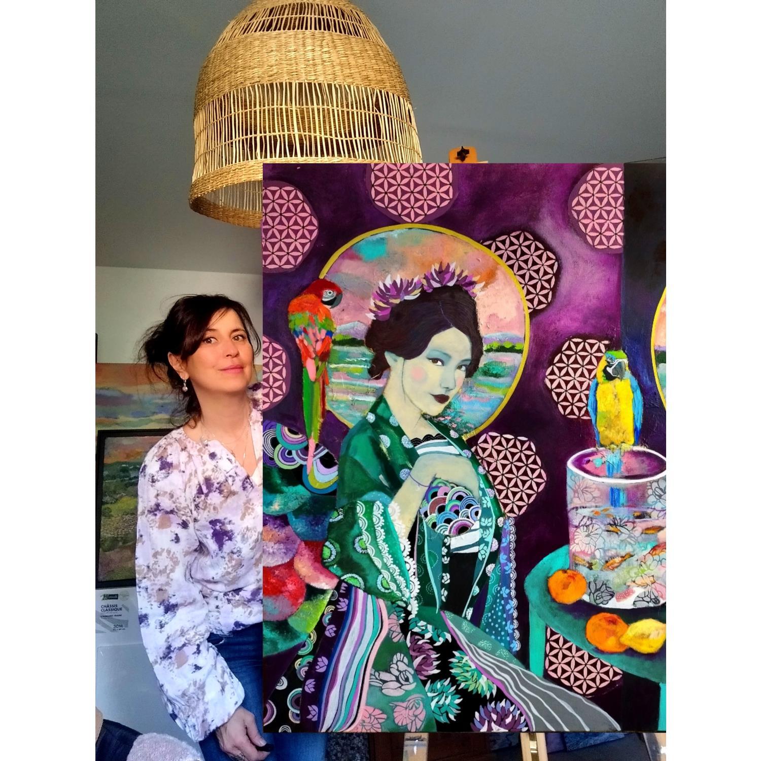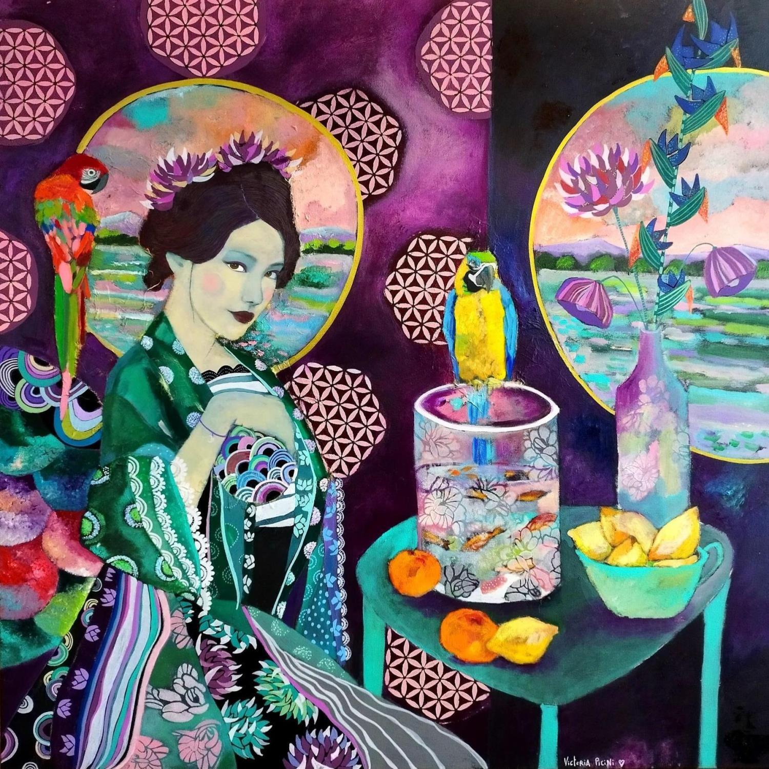 Dieses einzigartige und originelle zeitgenössische Kunstwerk "Geisha Purpurner Innenraum mit Papageien" wurde von der zeitgenössischen Künstlerin Picini Victoria geschaffen.
