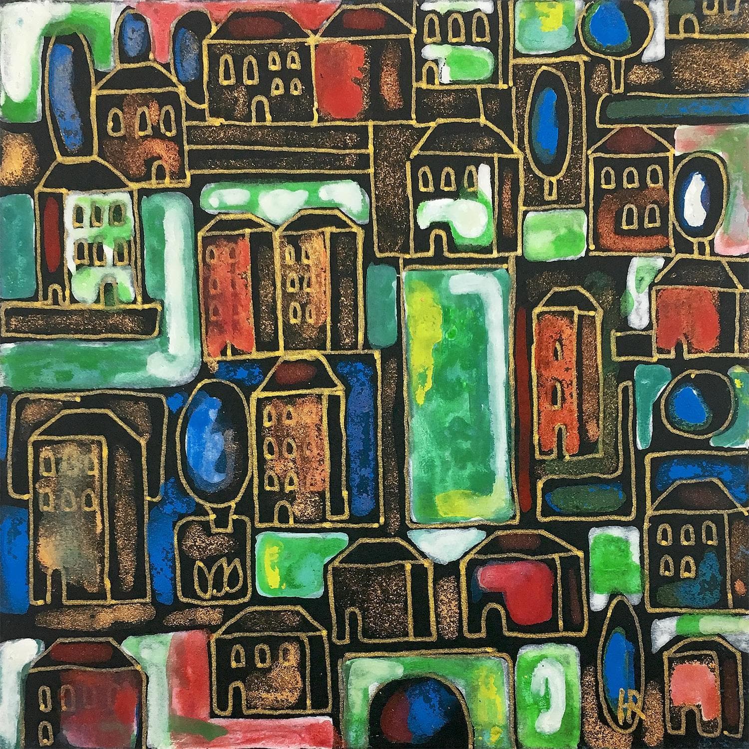 Gemälde G88 Green town von Ragas Huub | Gemälde Figurativ Urban Acryl