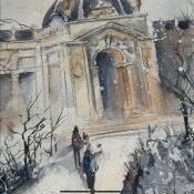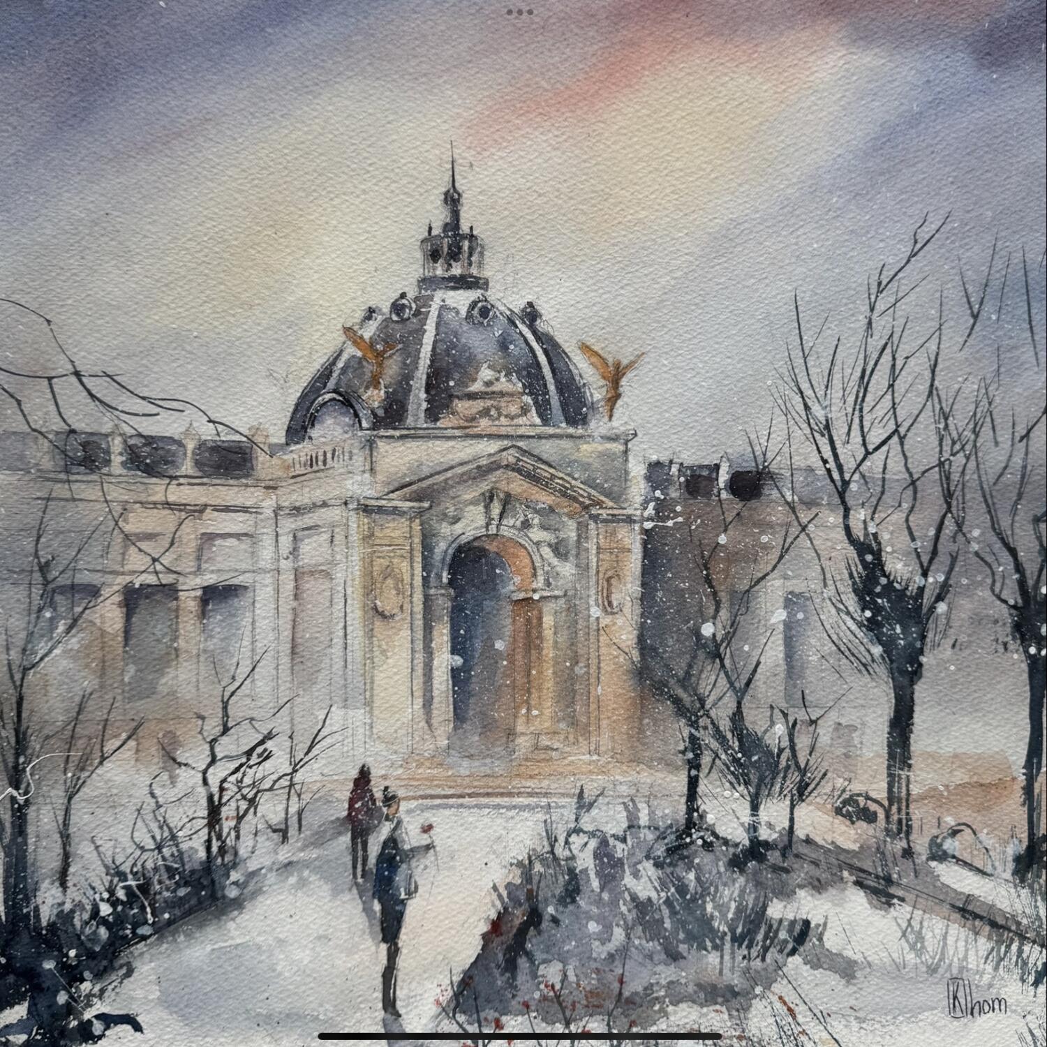 Das Aquarell fängt die Stille des Gartens, die kahlen Bäume und die gedämpfte Sanftheit eines zeitlosen Spaziergangs in Paris ein.