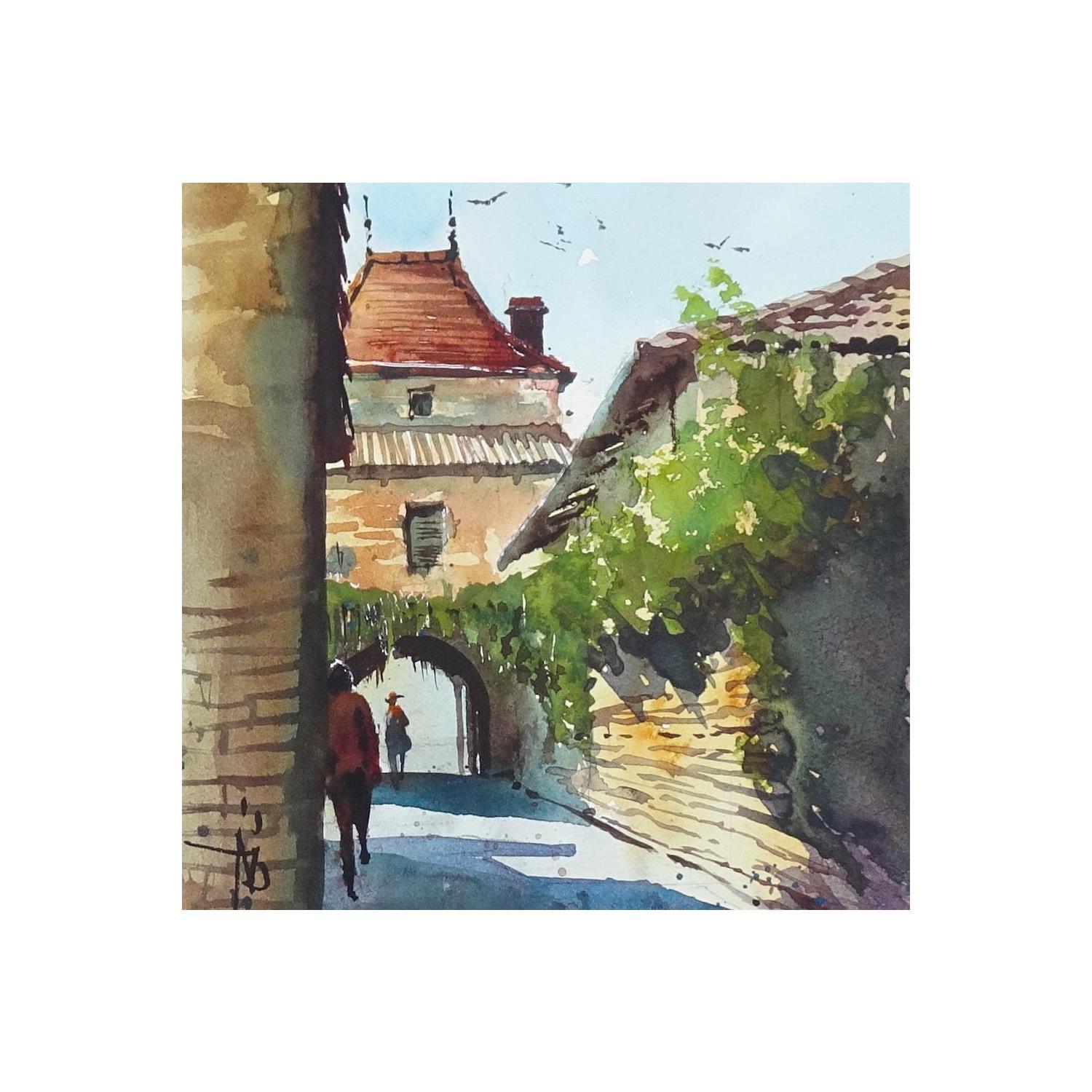Der Künstler verwendete Aquarell auf Papier, um dieses Kleine Gemälde zum Thema "Landschaften, Alltagsszenen" anzufertigen.