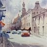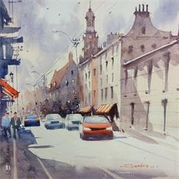 Der Künstler verwendete Aquarell auf Papier, um dieses Kleine Gemälde zum Thema "Urban" anzufertigen.