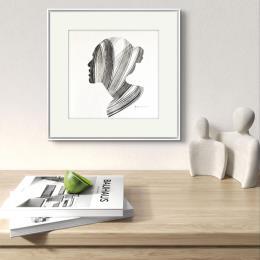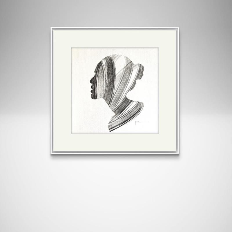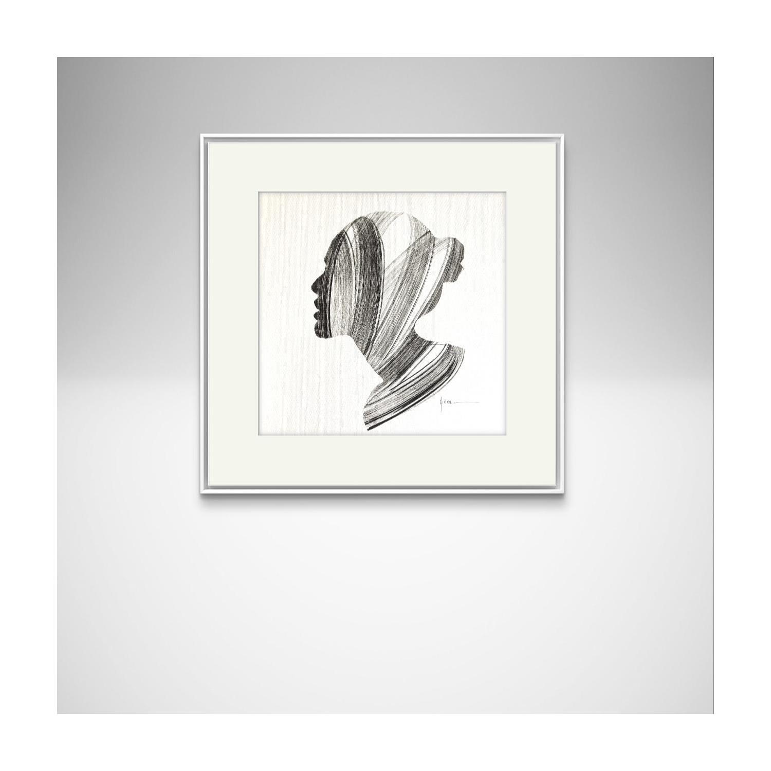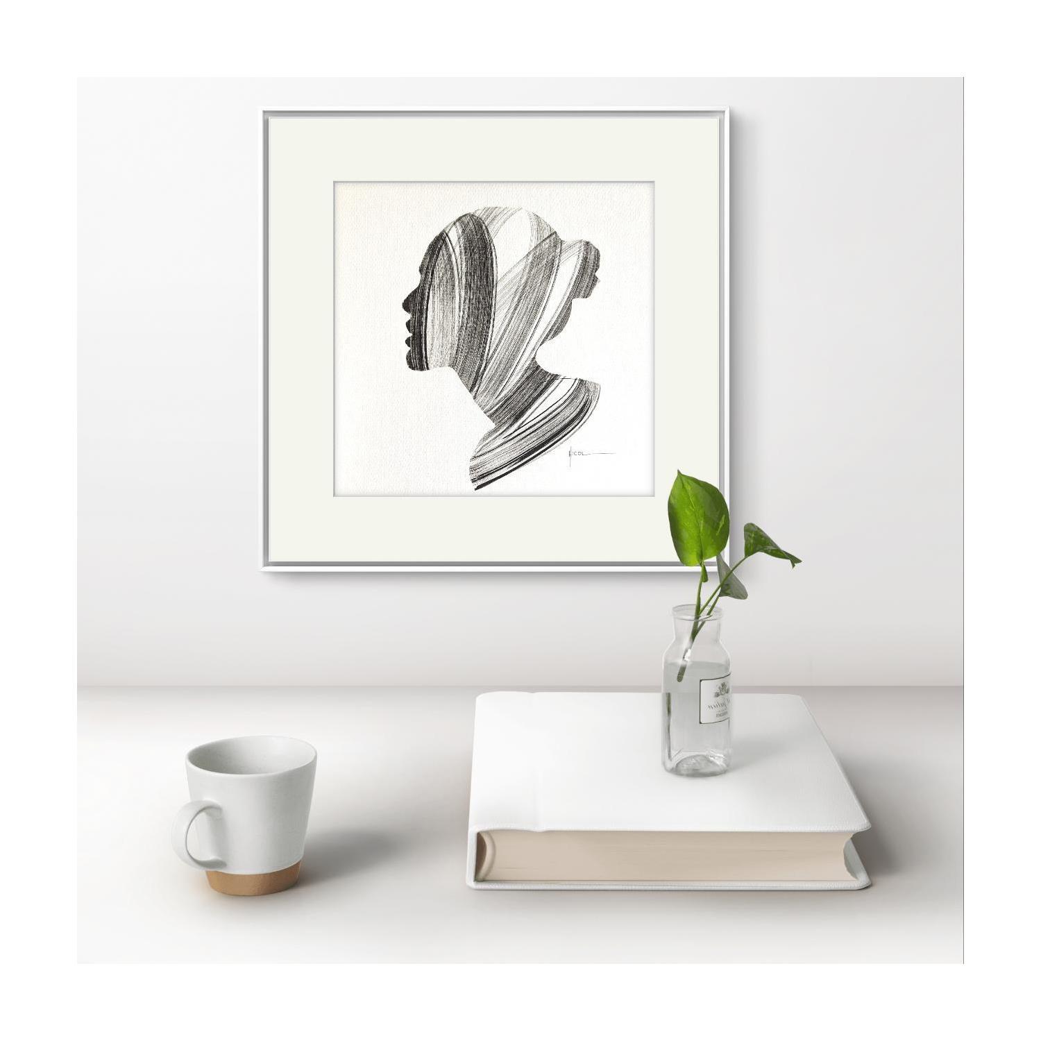Der Künstler verwendete Tinte auf Papier, um dieses Kleine Gemälde zum Thema "Minimalistisch, Schwarz & Weiß, Porträt" anzufertigen.