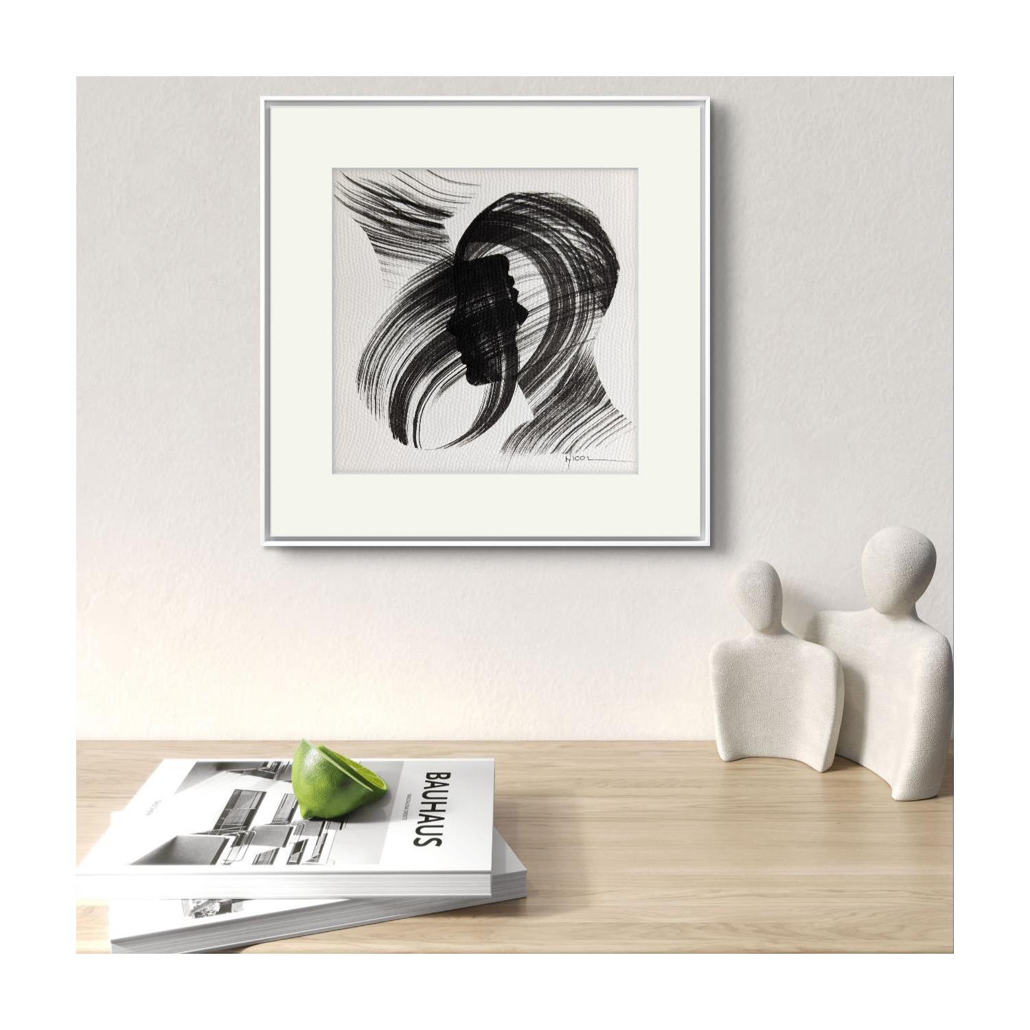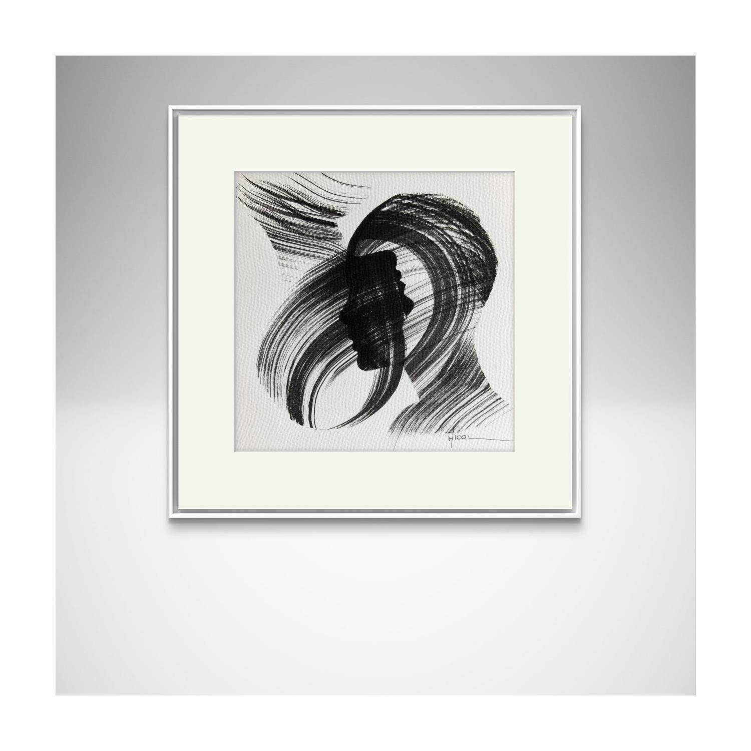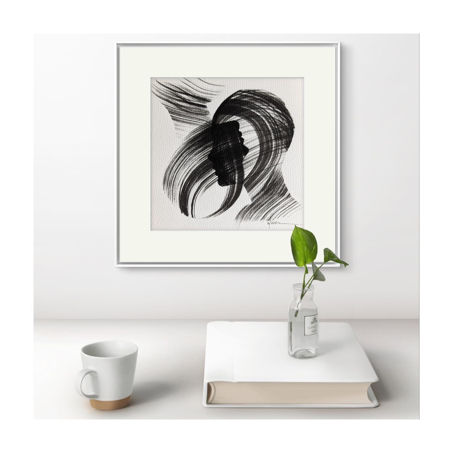 Der Künstler verwendete Tinte, Papier auf Papier, um dieses Kleine Gemälde zum Thema "Schwarz & Weiß, Porträt, Minimalistisch" anzufertigen.