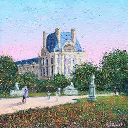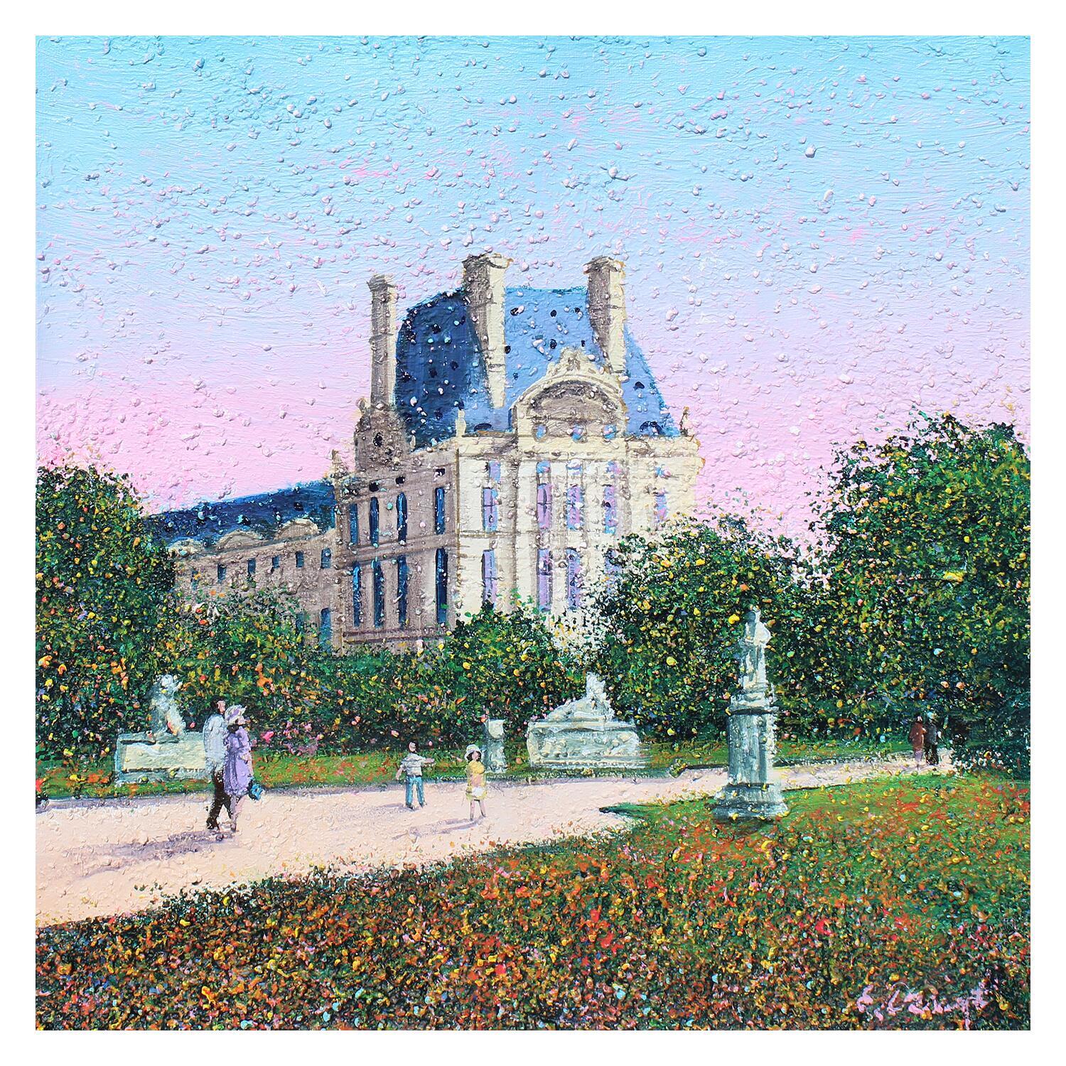 Dieses einzigartige und originelle zeitgenössische Kunstwerk "Dämmerung über dem Louvre" wurde von der zeitgenössischen Künstlerin Dessapt Elika geschaffen.