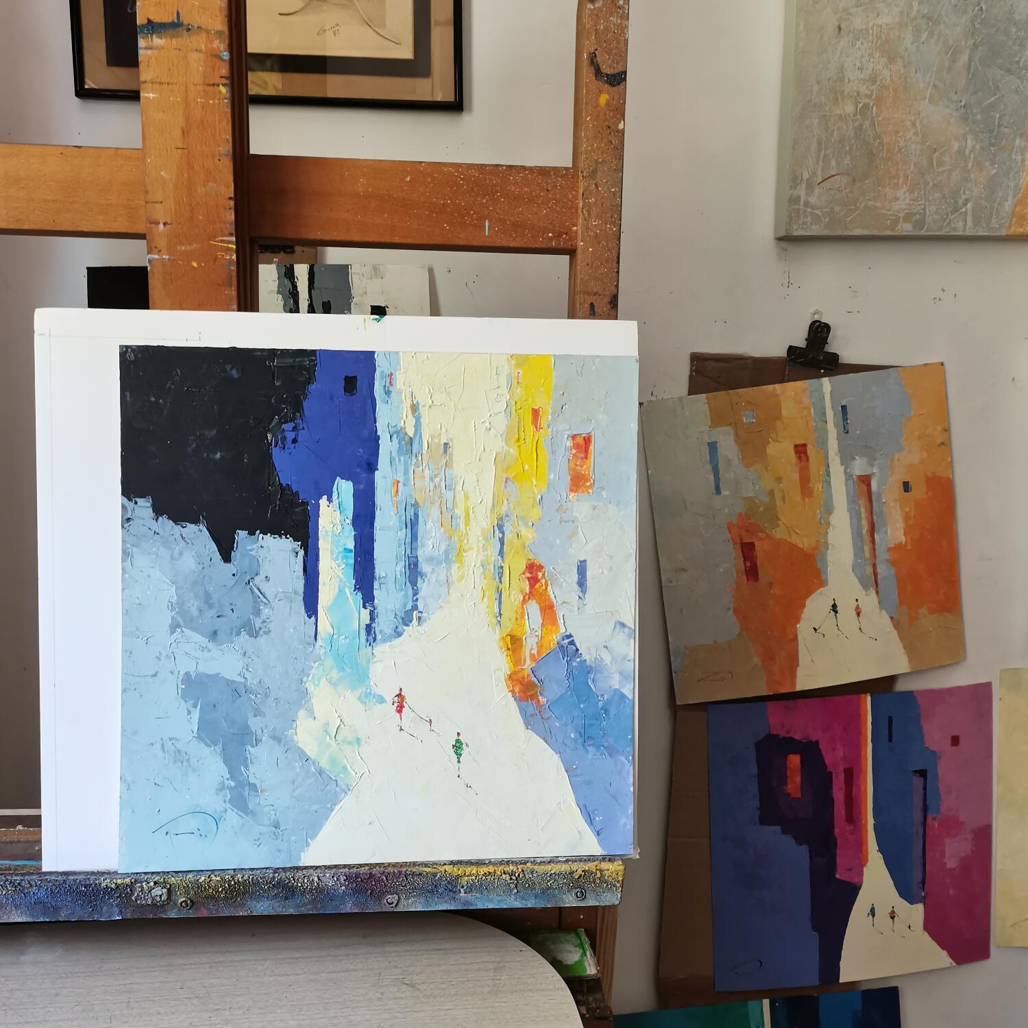 Der Künstler verwendete Öl auf Papier, um dieses Kleine Gemälde zum Thema "Urban" anzufertigen.