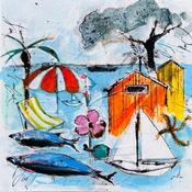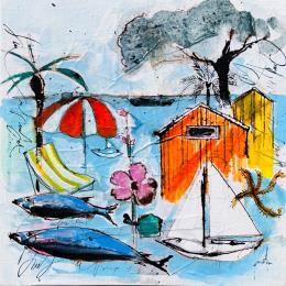 Dieses einzigartige und originale zeitgenössische Kunstwerk "Les cabanes de la mer" in dem Stil "Naive Kunst" wurde von dem zeitgenössischen Künstler Colombo Cécile kreiert.