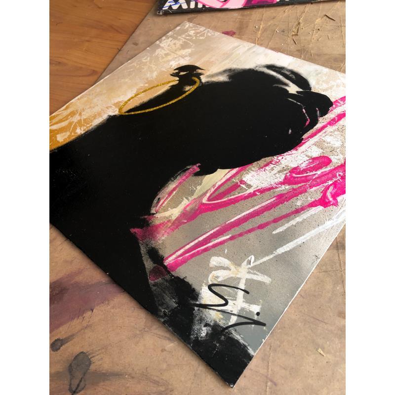 Der Künstler verwendete Acryl, Graffiti auf Leinenkarton, um dieses Kleine Gemälde zum Thema "Pop-Ikonen, Modus" anzufertigen.