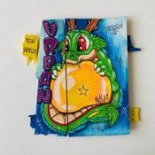 Der Künstler verwendete Holz, Acryl, Posca auf Holz, um dieses Kleine Gemälde zum Thema "Pop-Ikonen" anzufertigen.