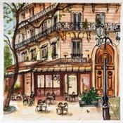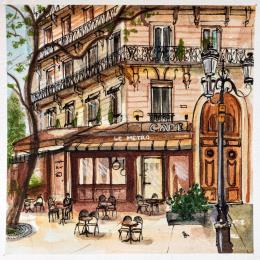Die Künstlerin verwendete Aquarellfarben und feine Filzstifte, um dieses kleinformatige Gemälde mit seinem einzigartigen Stil zu schaffen.