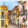 Die Künstlerin verwendete Aquarellfarben und Fineliner, um dieses kleinformatige Gemälde mit seinem einzigartigen Stil zu schaffen.