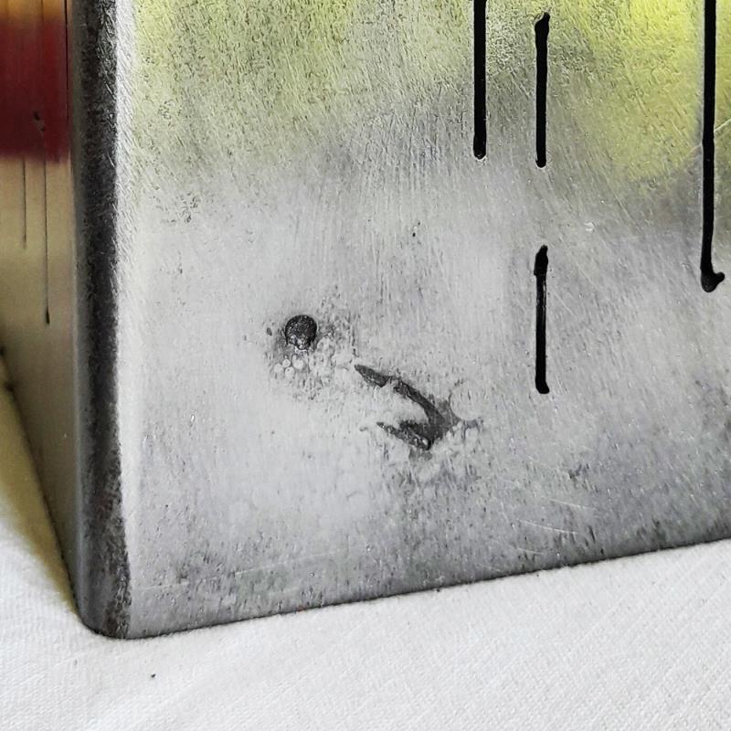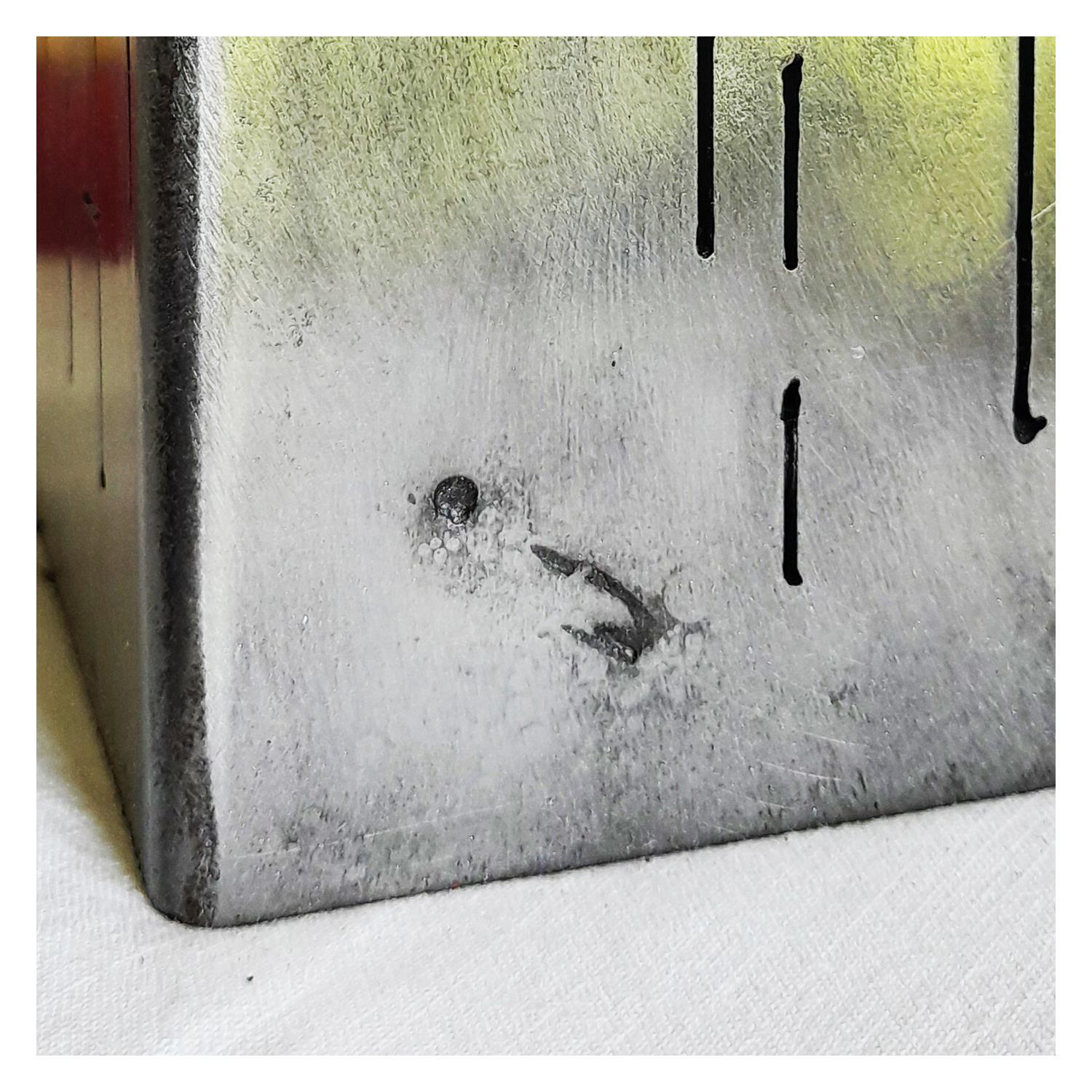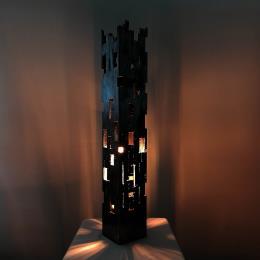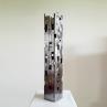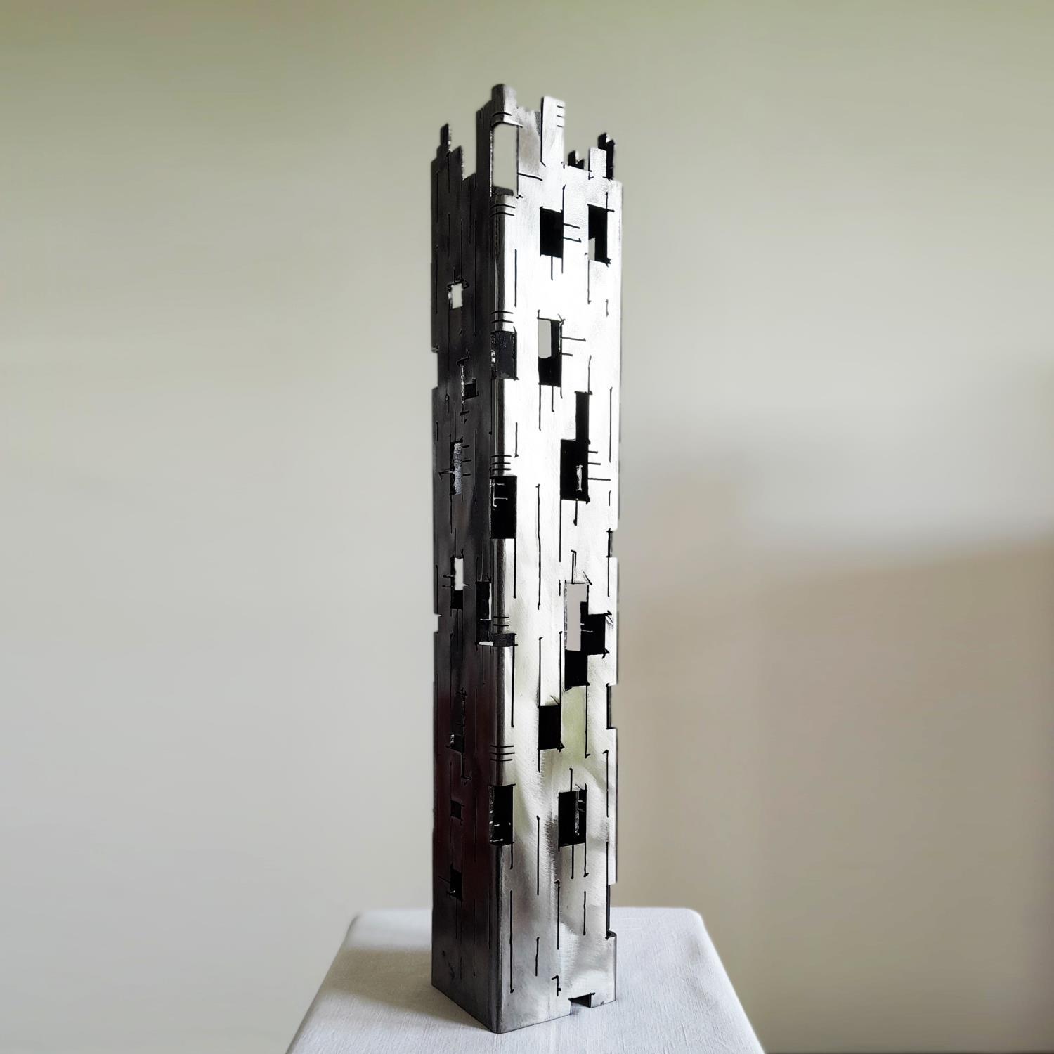 Der Künstler verwendete die Technik des Plasmaschneidens, um diese mittelgroße Skulptur aus Stahl mit dem Thema Urban zu schaffen.