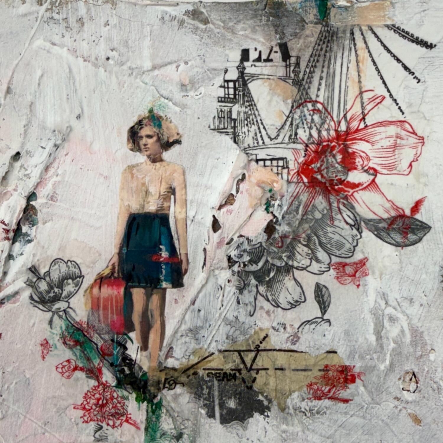 Die Künstlerin verwendete Mischtechniken: Collage, Texturen, Bleistifte, Pastellfarben, um dieses kleinformatige Gemälde auf weicher Leinwand im abstrakt-surrealistischen Stil zu schaffen.