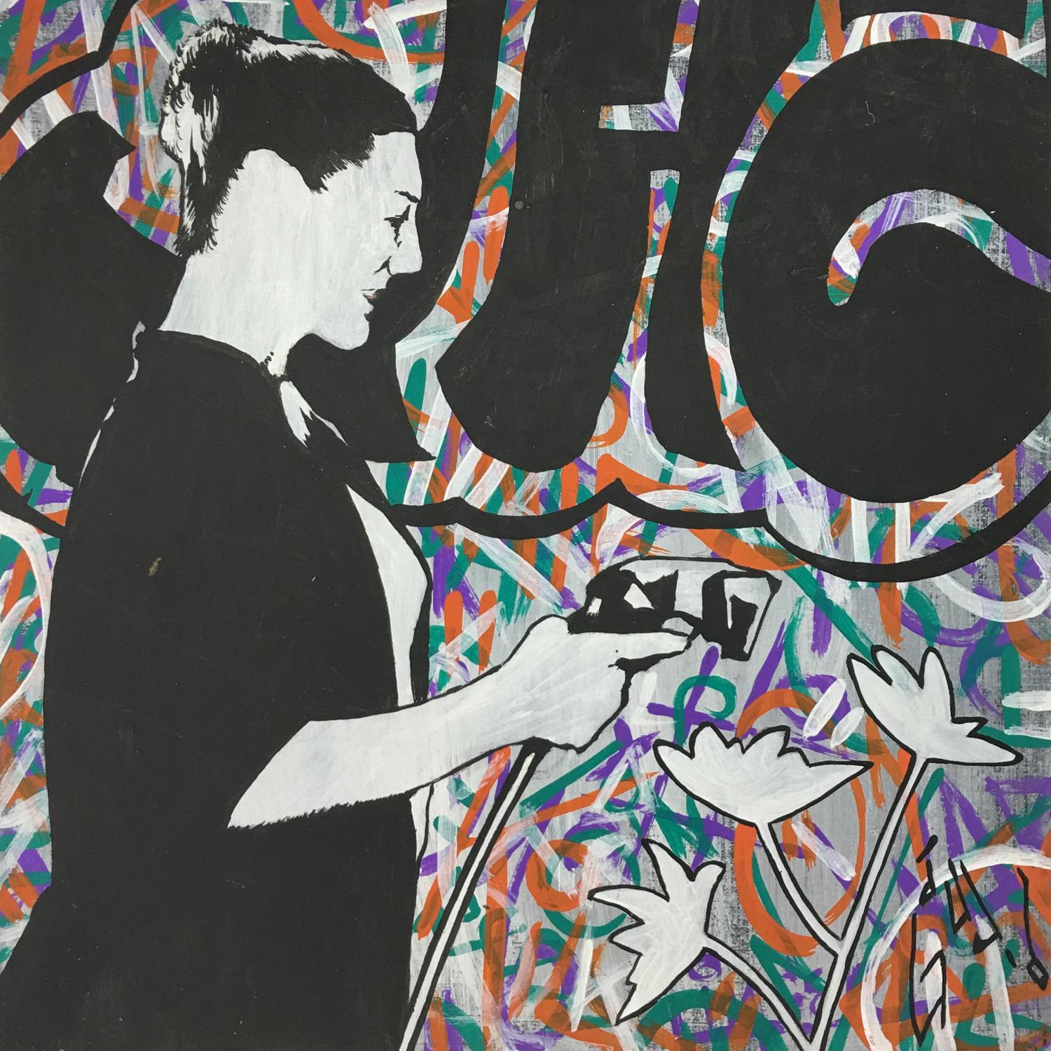 Der Künstler verwendete Acryl, Graffiti auf Leinwand, um dieses Kleine Gemälde zum Thema "Alltagsszenen" anzufertigen.