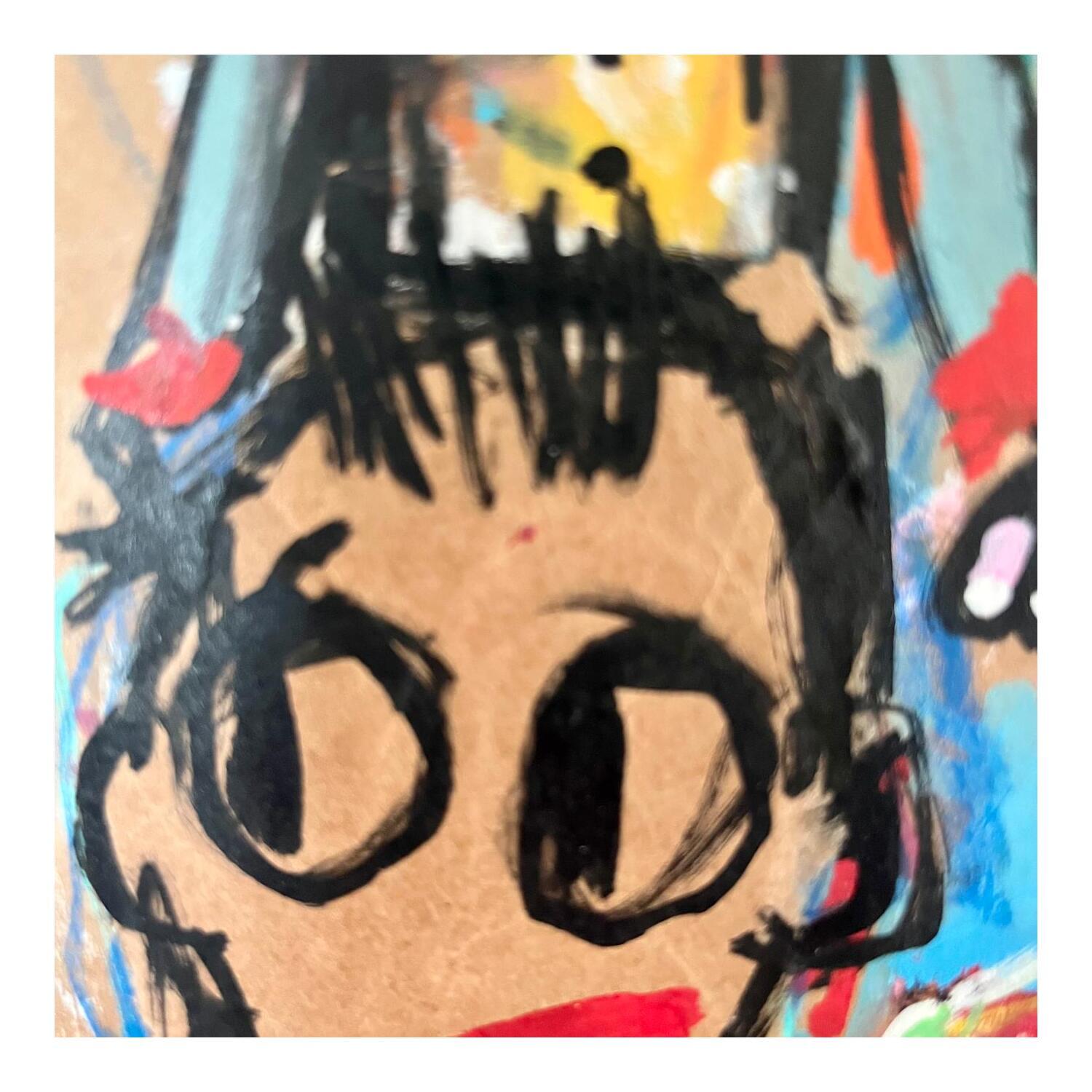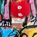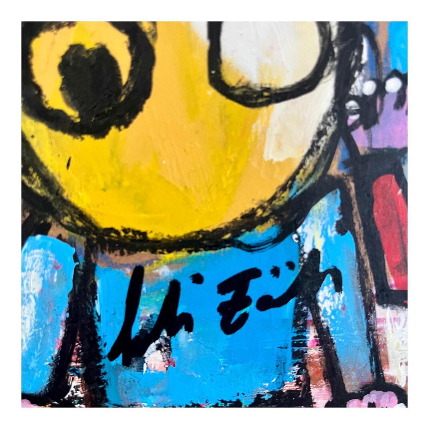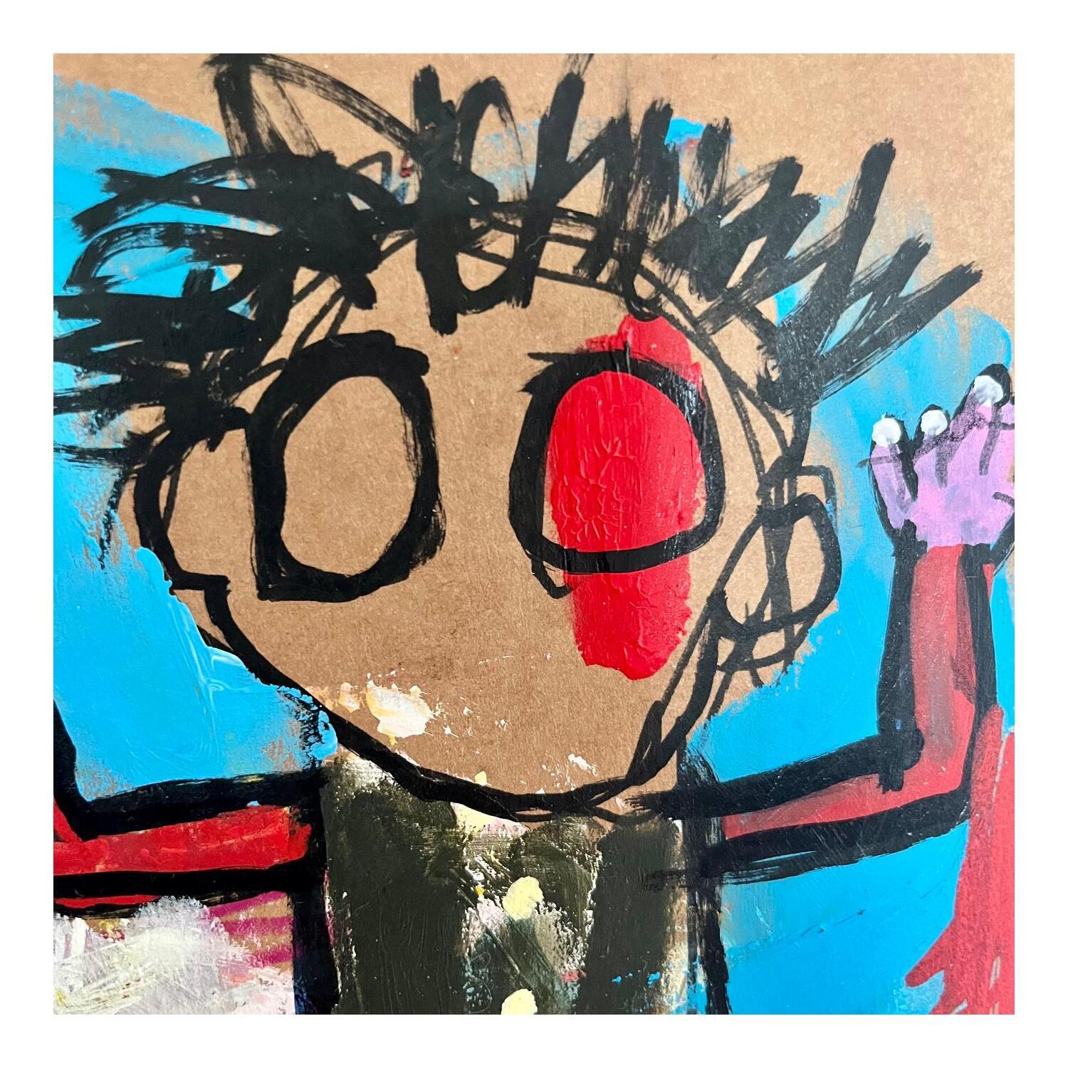 Der Künstler verwendete Acryl, Pappe, Pastell, Posca auf Pappe, um dieses Kleine Gemälde zum Thema "Alltagsszenen" anzufertigen.