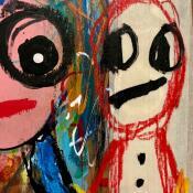 Der Künstler verwendete Pastell, Posca, Acryl auf Pappe, um dieses Kleine Gemälde zum Thema "Alltagsszenen" anzufertigen.