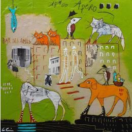 Der Künstler verwendete die Mischtechnik, um dieses kleinformatige Gemälde auf Papier im Stil der Art Singulier mit dem Thema Tiere zu schaffen.