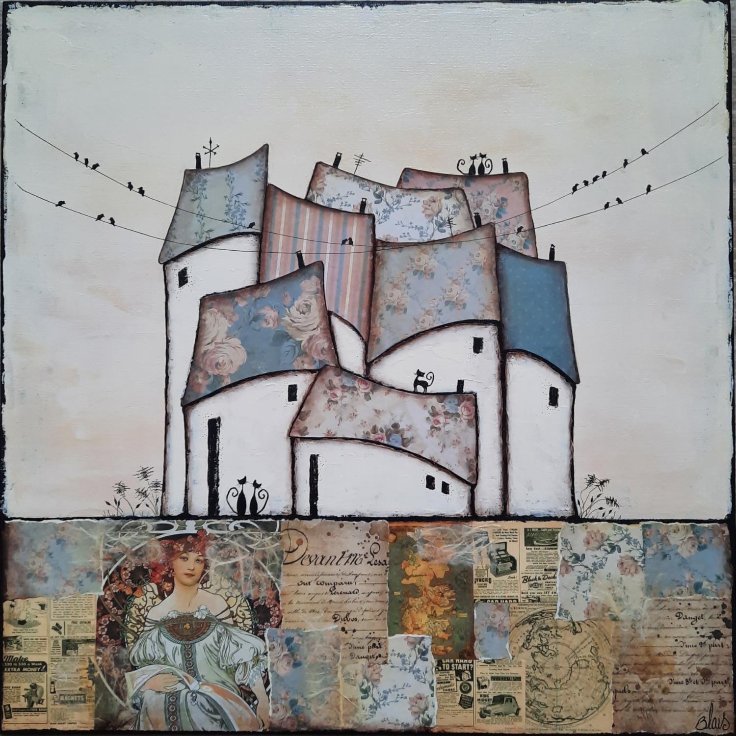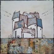 Der Künstler verwendete Acryl, Collage auf Leinenkarton, um dieses Kleine Gemälde zum Thema "Landschaften" anzufertigen.