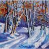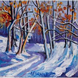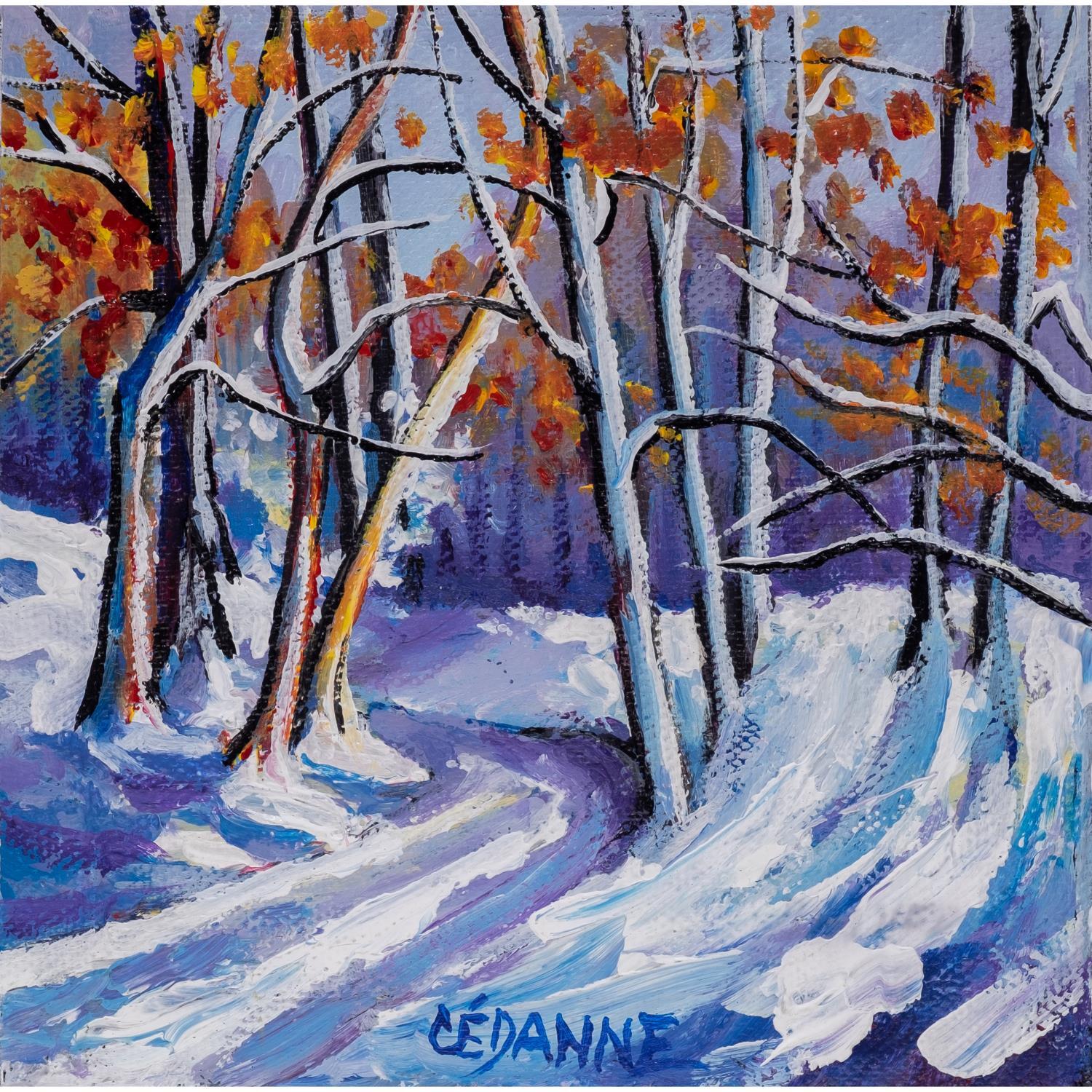 Dieses einzigartige und originelle zeitgenössische Kunstwerk im figurativen Stil wurde von dem Maler Cèdanne geschaffen. Der Künstler verwendete verschiedene Techniken, um dieses kleinformatige Gemälde auf Leinwand zu schaffen und die Landschaft eines Waldwegs unter dem ersten Schnee in seinem eigenen einzigartigen Stil zu behandeln.