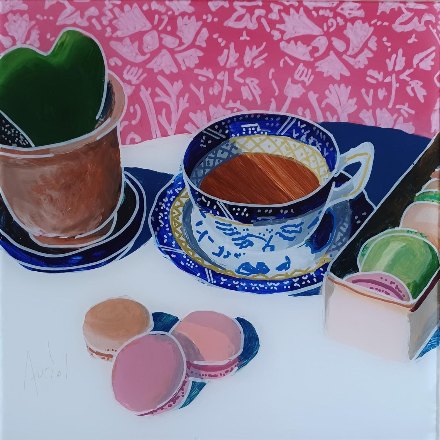 Der Künstler verwendete Acryl, Plexiglas, Posca auf Plexiglas, um dieses Kleine Gemälde zum Thema "Stillleben" anzufertigen.