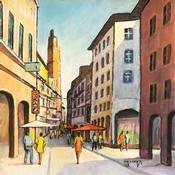 Der Künstler verwendete Acryl auf Papier, um dieses Kleine Gemälde zum Thema "Urban, Alltagsszenen, Architektur" anzufertigen.