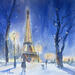 In diesem Aquarell schaffen die bläulichen Töne und goldenen Reflexe eine sanfte, einhüllende Atmosphäre, die an winterliche Poesie und den Zauber von Paris erinnert.