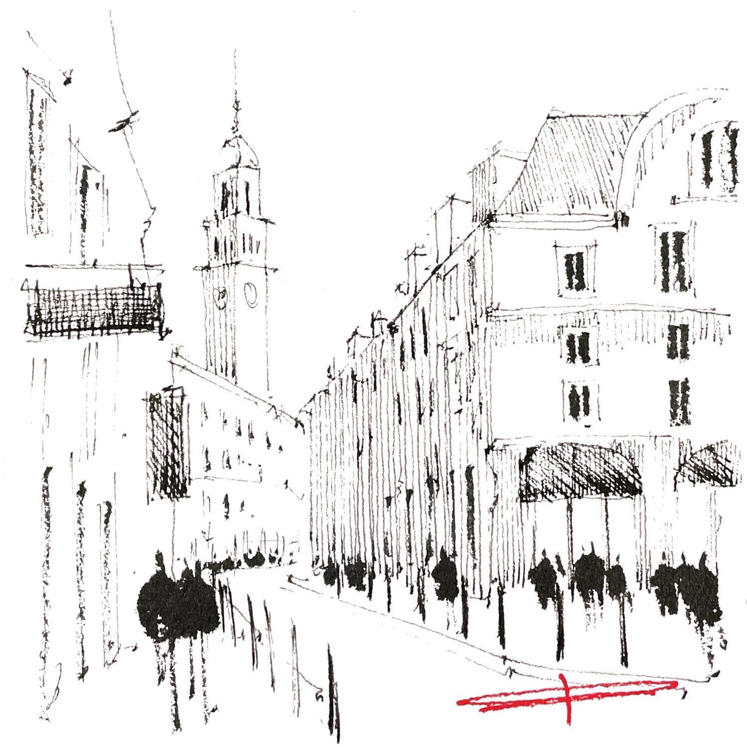 Gemälde Monochrome d'une déambulation lilloise von Bailly Kévin  | Gemälde Figurativ Urban Architektur Aquarell Tinte