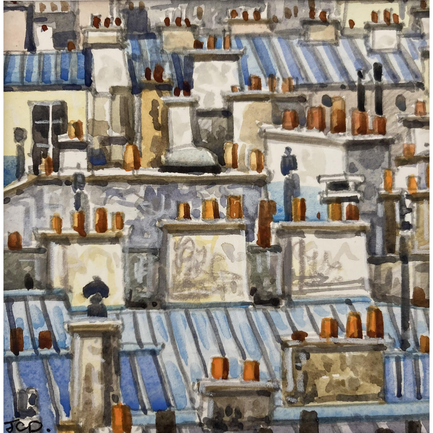 Der Künstler verwendete Aquarell auf Papier, um dieses Kleine Gemälde zum Thema "Urban" anzufertigen.