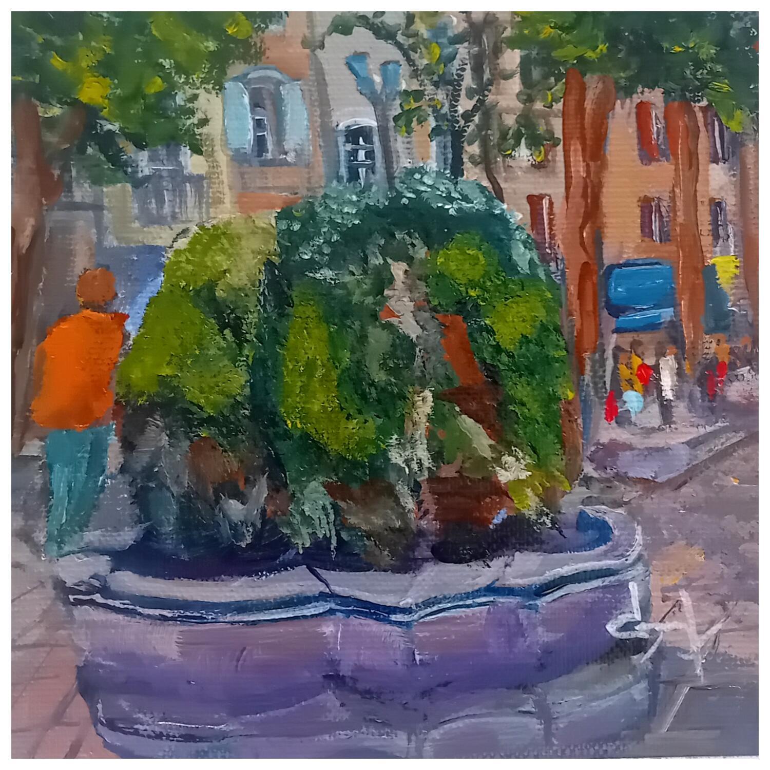 Die Künstlerin verwendete die Öltechnik, um dieses kleinformatige Gemälde auf Leinwand im figurativen Stil mit den Themen Urban, Szenen aus dem Leben, Landschaften zu schaffen.