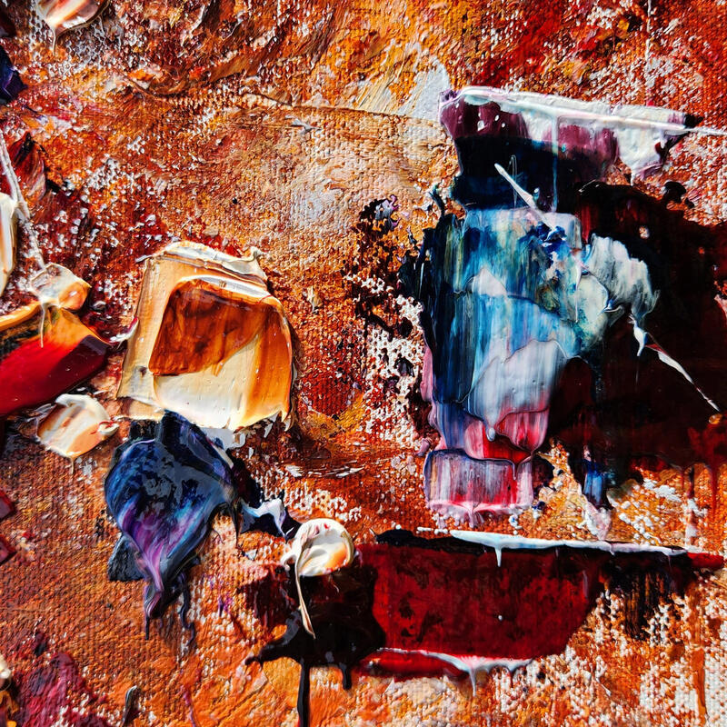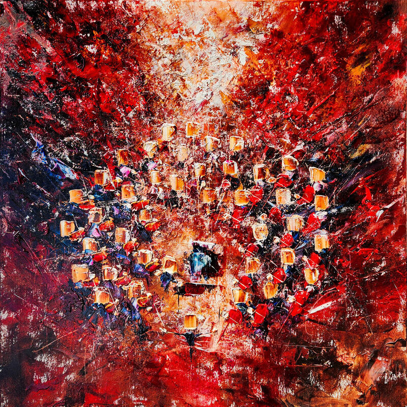 Das Konzert mit Pianist ist ein Werk, das zwischen Abstraktion am Rand und naiver Kunst im Zentrum sowie der Darstellung der Instrumentalisten oszilliert. Das Motiv ist mit Spachtel und Öl gemalt und spielt mit einer Harmonie aus warmen Farben (Rot- und Orangetöne) und metallischen Farben (Gold, Kupfer und Silber...). Die quadratischen Köpfe der Figuren sind von der Serie „Parc des Princes” von Nicolas de Staël inspiriert. Die Inszenierung hebt den Pianisten in der Mitte hervor und spielt mit der Kreisförmigkeit (die Formation) und der Vertikalität (der Hintergrund). Der Dirigent, isoliert und in einer majestätischen Haltung, schließt den unteren Teil des Werks ab. Das Ensemble präsentiert eine sogenannte extravagante oder barocke Tonalität... je nach Empfinden.