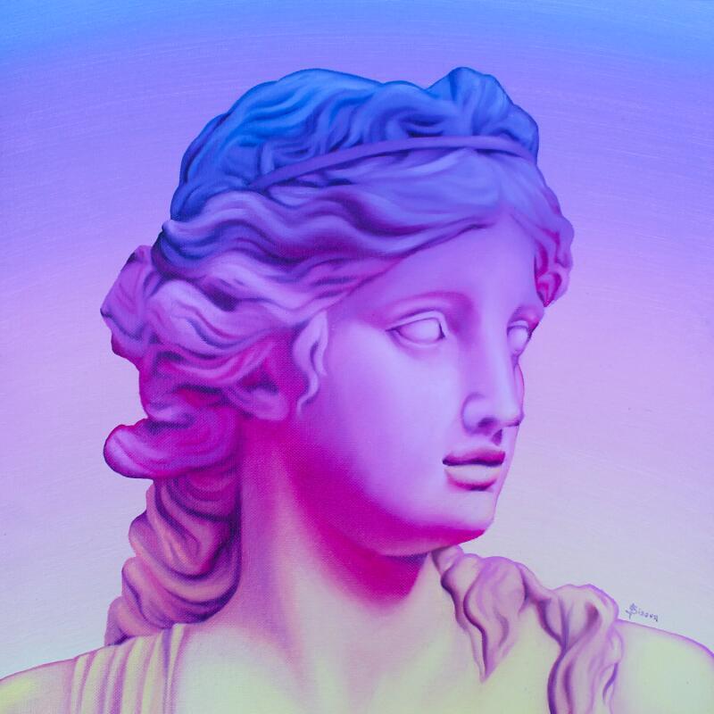 Artemis, eine Figur der Freiheit, der wilden Natur und der Intuition, wird hier in einer hellen, dunstigen Palette neu interpretiert, die von Sonnengelb bis zum dämmrigen Violett reicht. Die sanften Farbtöne kontrastieren mit der Kraft des Blicks und unterstreichen die Komplexität dieser heftig unabhängigen Gottheit. Zwischen stiller Kraft und ätherischer Präsenz beschwört das Porträt eine heilige, zeitlose und vibrierende Weiblichkeit herauf.