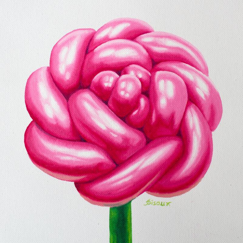 Ballonskulpturen sind eine große Inspirationsquelle für die Künstlerin Morgan Bisoux. Sie malt diese Alltagsgegenstände, die mit festlicher Stimmung in Verbindung gebracht werden, mit großer Präzision, sodass die Pinselstriche fast verschwinden.