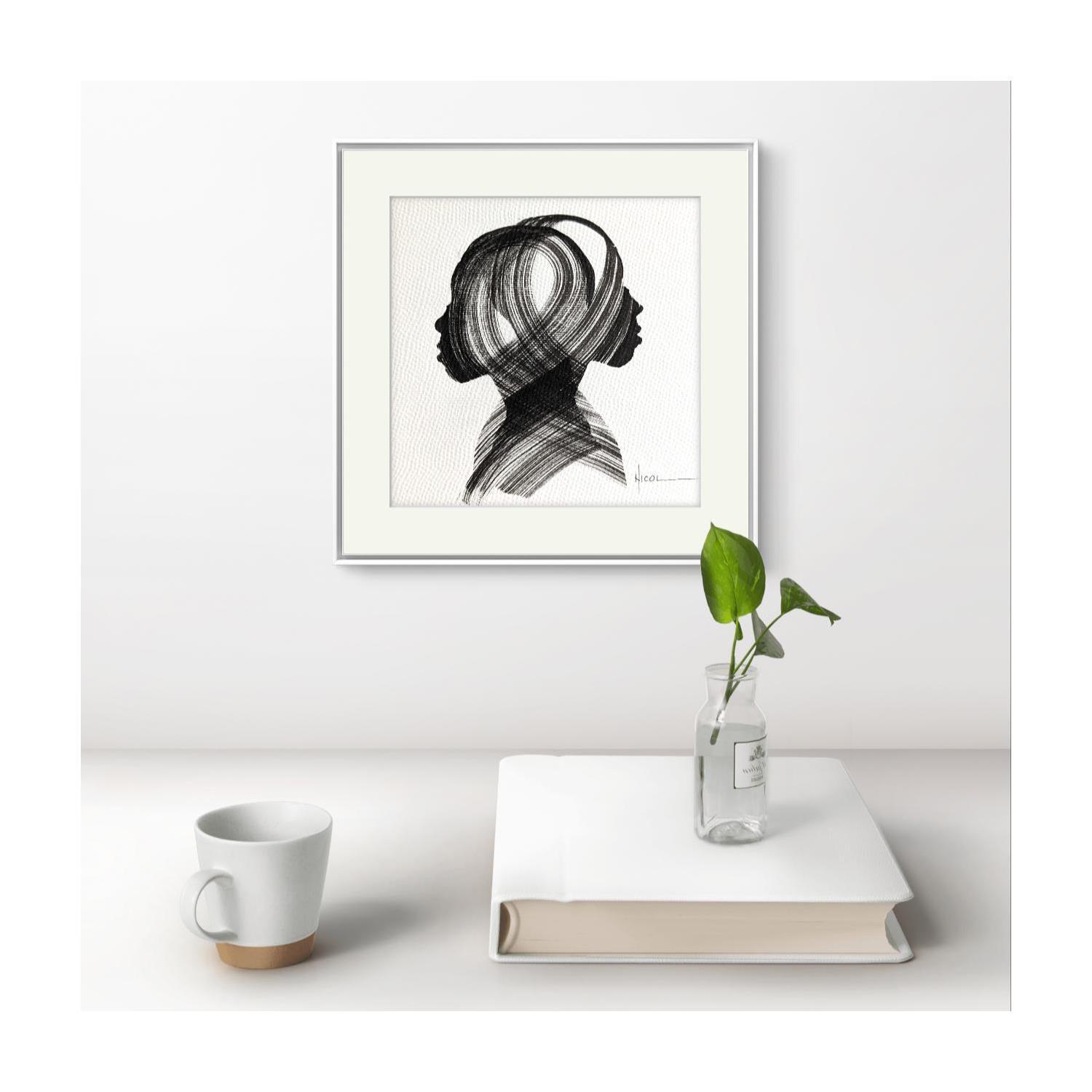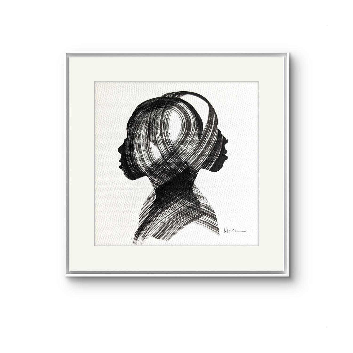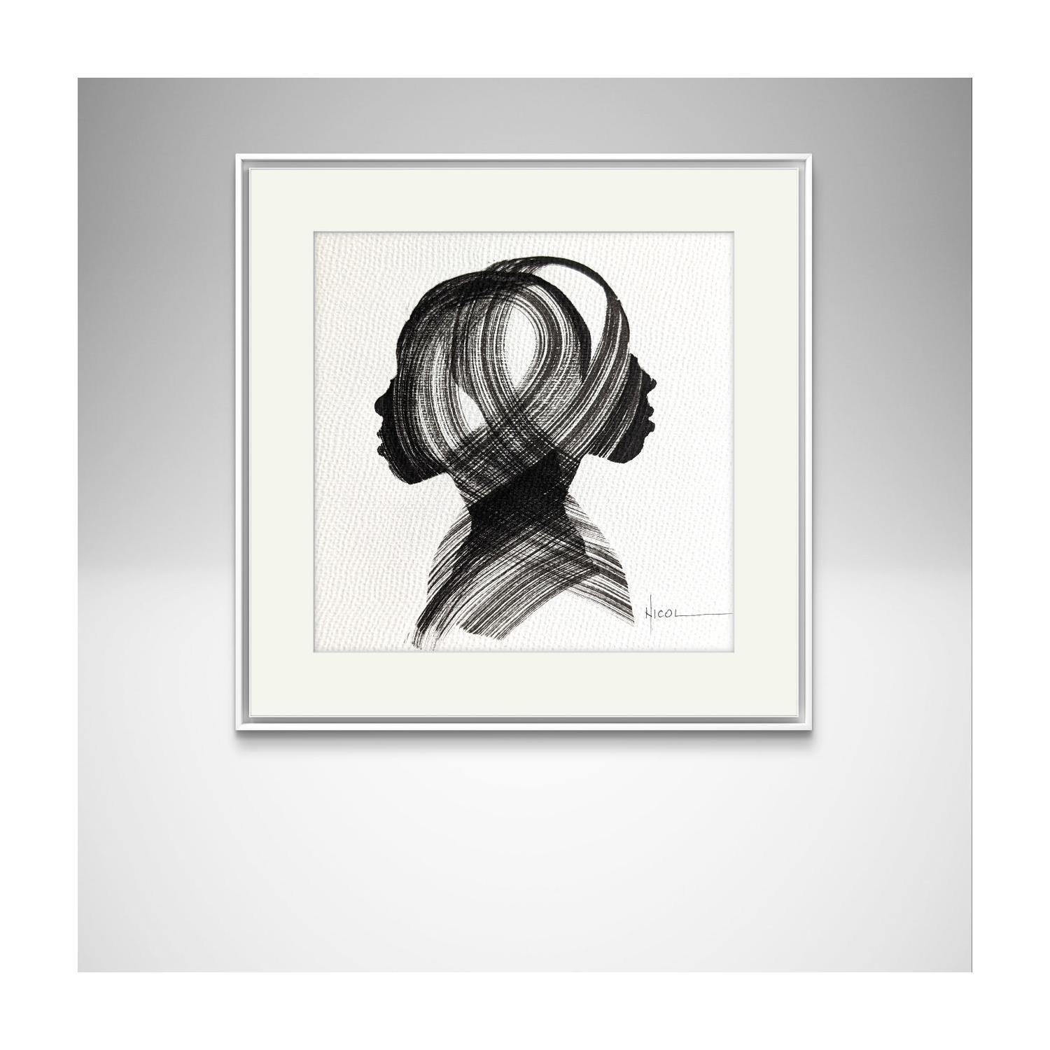 Der Künstler verwendete Tinte, Papier auf Papier, um dieses Kleine Gemälde zum Thema "Minimalistisch, Schwarz & Weiß, Porträt" anzufertigen.