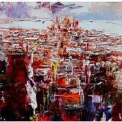 Das Werk "NYC" stellt die Megalopolis auf eher abstrakte Weise dar. Sie wählt einen überhängenden Blickpunkt, um die Perspektive durch eine Abfolge von Volumen mit abnehmender Größe aufzubauen, die so Gigantismus simulieren. Das Motiv ist mit Messer und Ölfarbe gemalt und spielt mit den Gegensätzen zwischen warmen (Rottöne) und kalten (Blautöne) Farben. Die Proportionen des Gemäldes lassen die Stadt gut zur Geltung kommen und der Horizont ist sehr hoch angesetzt, um die Perspektive und den Fluchtpunkt zu betonen...