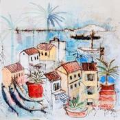Escale marineGemälde Escale marine von Colombo Cécile | Gemälde Naive Kunst Landschaften Natur Alltagsszenen Aquarell Acryl Collage Tinte Pastell
