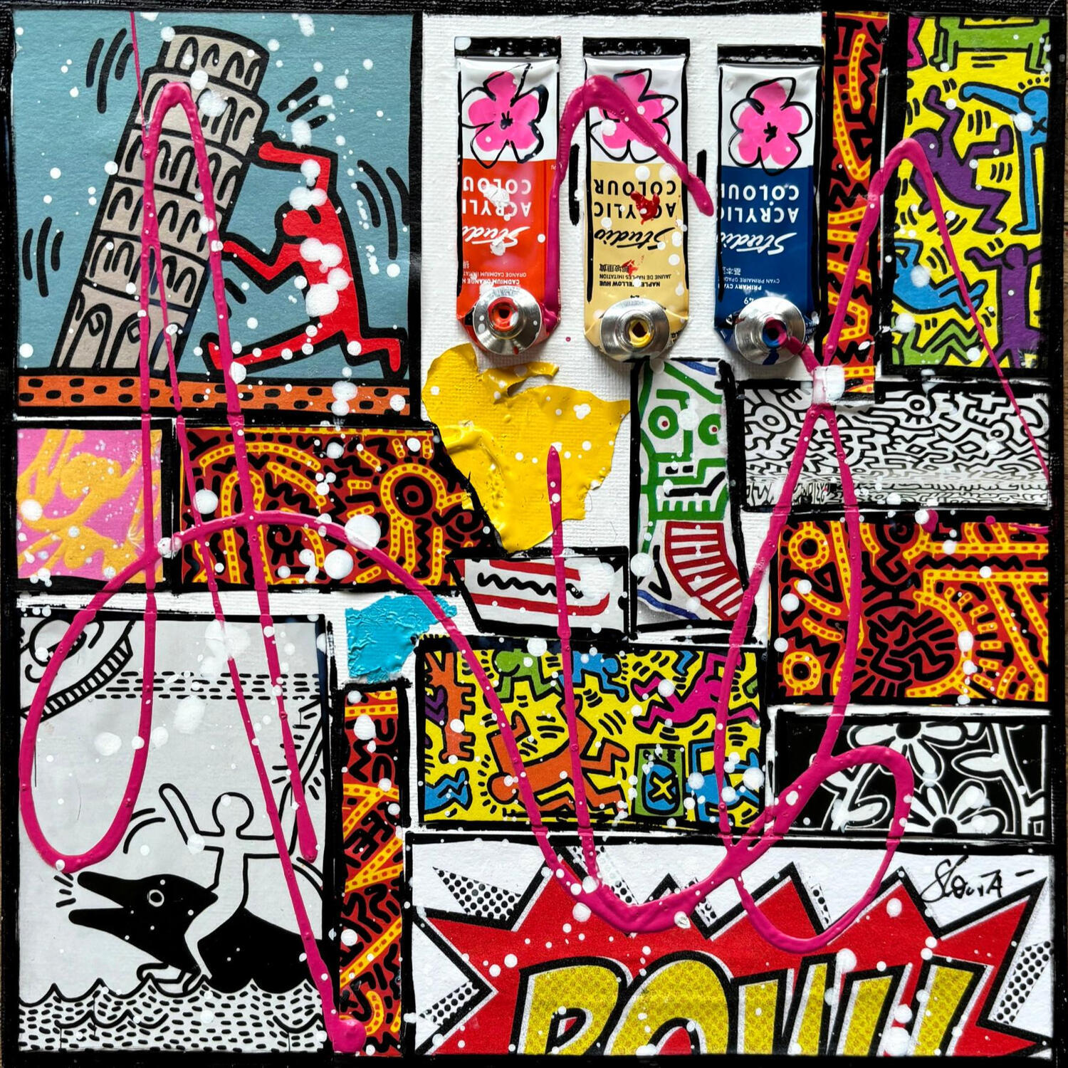 Dieses einzigartige und originale zeitgenössische Kunstwerk "Tribute to K.Haring" in dem Stil "Pop-Art" wurde von dem zeitgenössischen Künstler Costa Sophie kreiert.