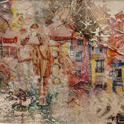 Der Künstler verwendete Acryl, Collage, Öl auf Papier, um dieses Kleine Gemälde anzufertigen.