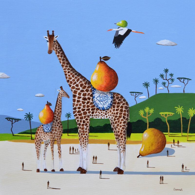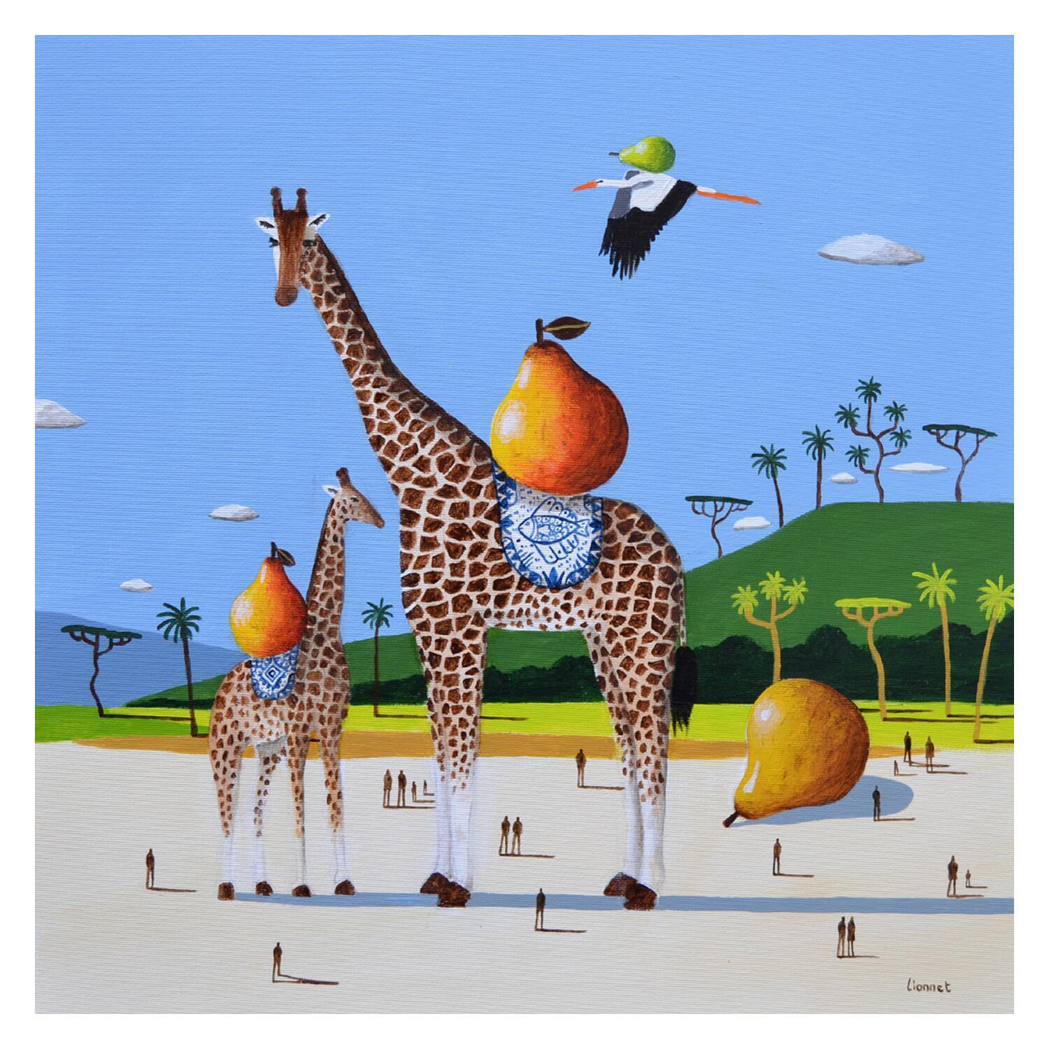 Dieses einzigartige und originale zeitgenössische Kunstwerk "Girafe et girafon au poires" in dem Stil "Surrealismus" wurde von dem zeitgenössischen Künstler Lionnet Pascal kreiert.