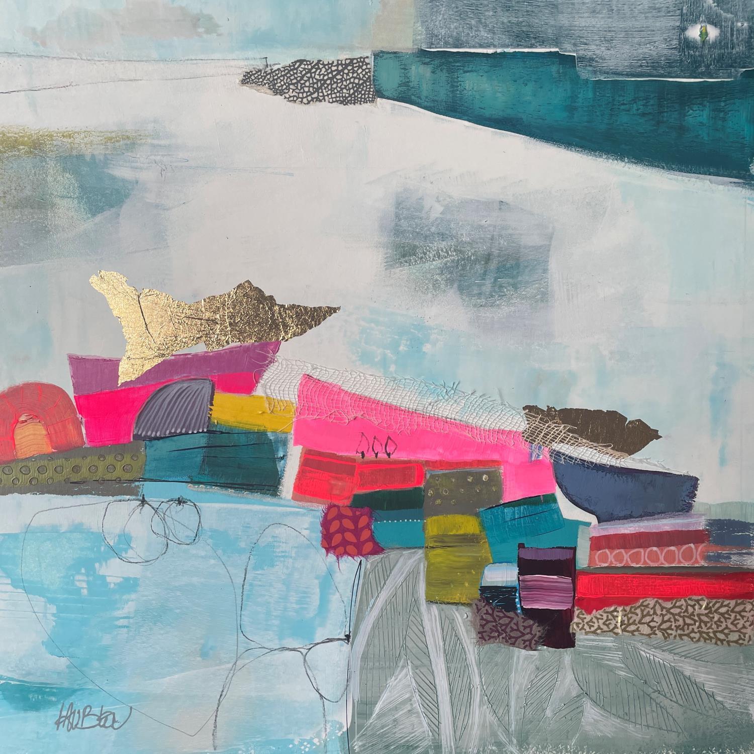 Der Künstler verwendete Acryl, Collage, Blattgold, Papier auf Pappe, um dieses Kleine Gemälde zum Thema "Landschaften" anzufertigen.