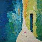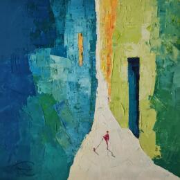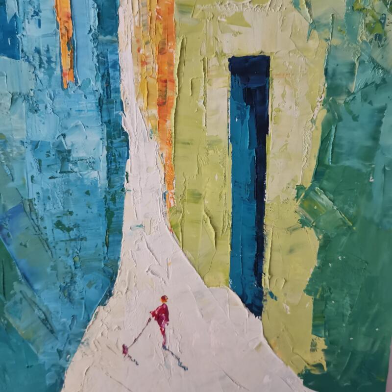 Der Künstler verwendete Öl auf Papier, um dieses Kleine Gemälde zum Thema "Urban" anzufertigen.