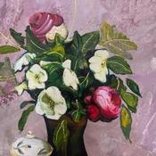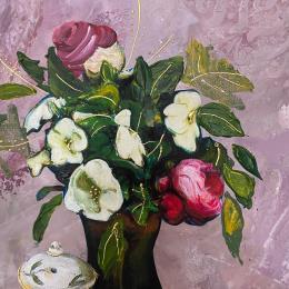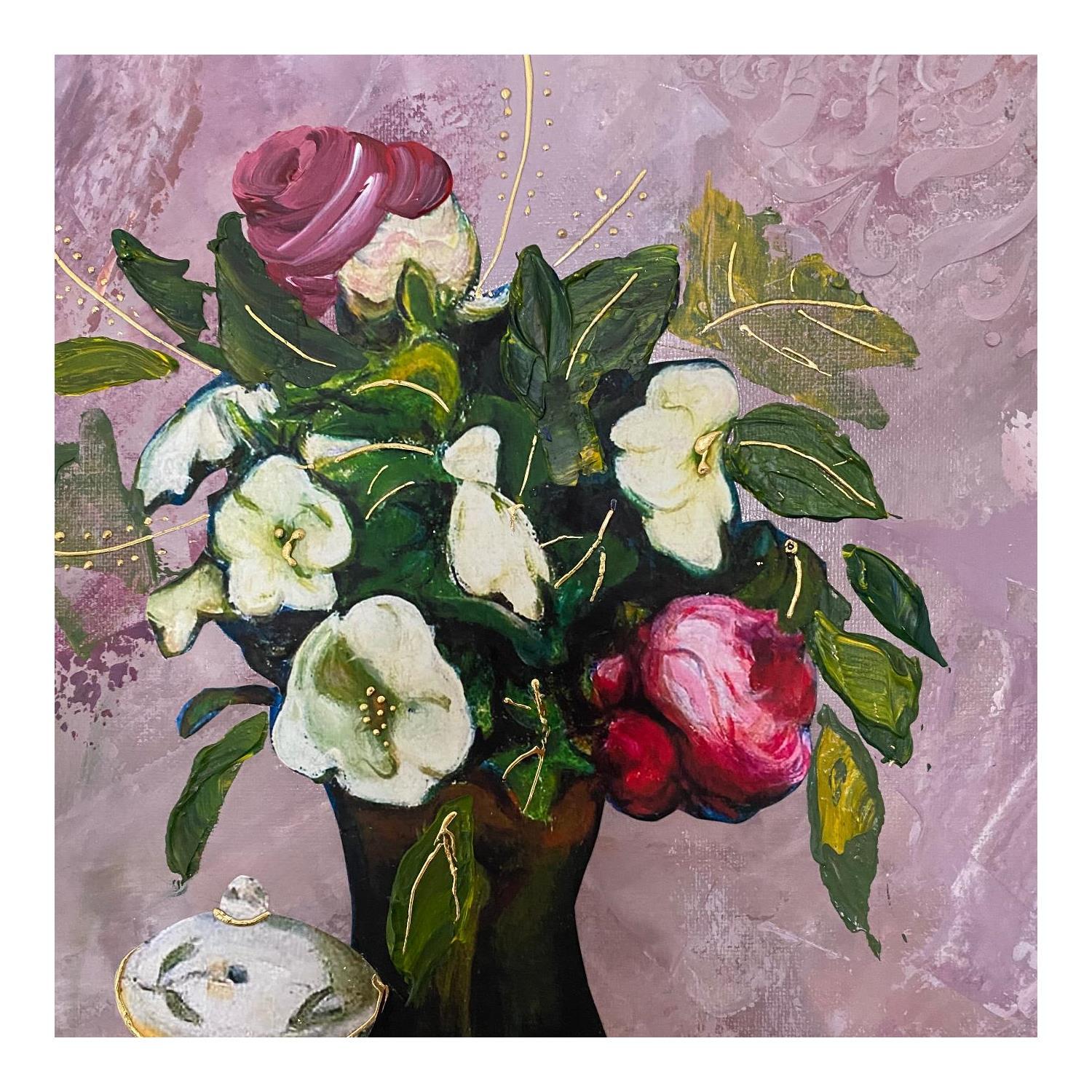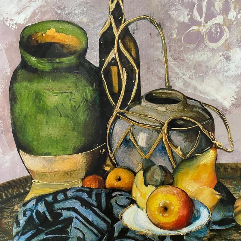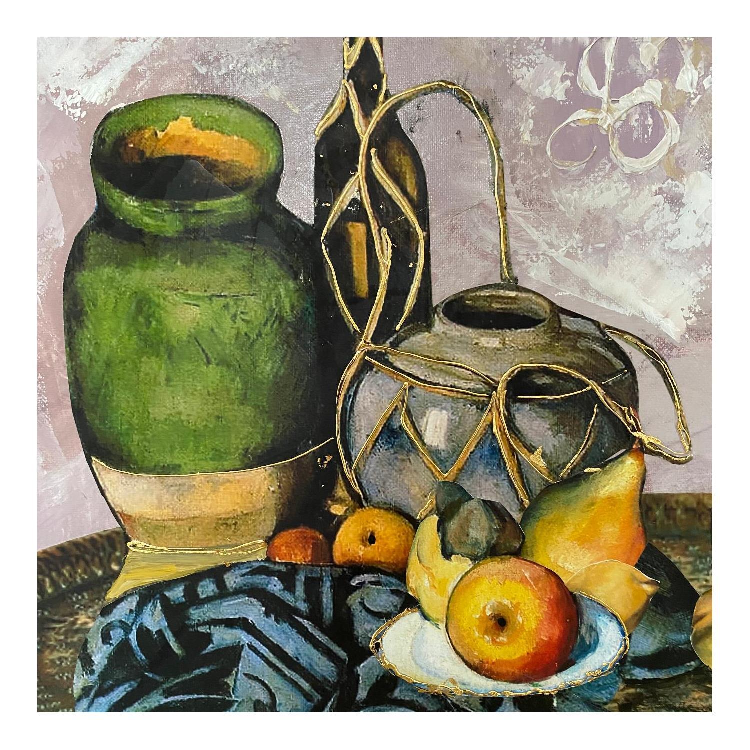 Der Künstler verwendete Acryl, Collage, Posca, Pastell, Blattgold, Papier auf Leinwand, um dieses Große Gemälde zum Thema "Alltagsszenen, Stillleben" anzufertigen.